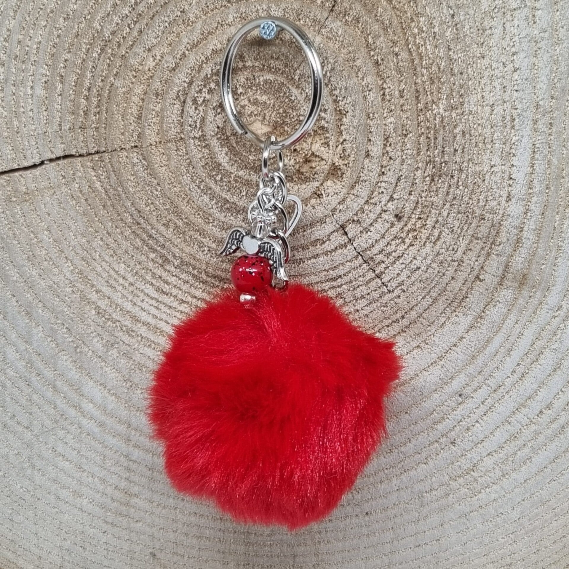 Aan deze ring sleutelhanger hangt een rode pluche pom pom, bedeltje van een hartje en natuurlijk een geluksengeltje. Het geluksengeltje heeft een rode kraal met wit en zwarte vlekjes als buik en een transparant kraaltje als hoofdje.