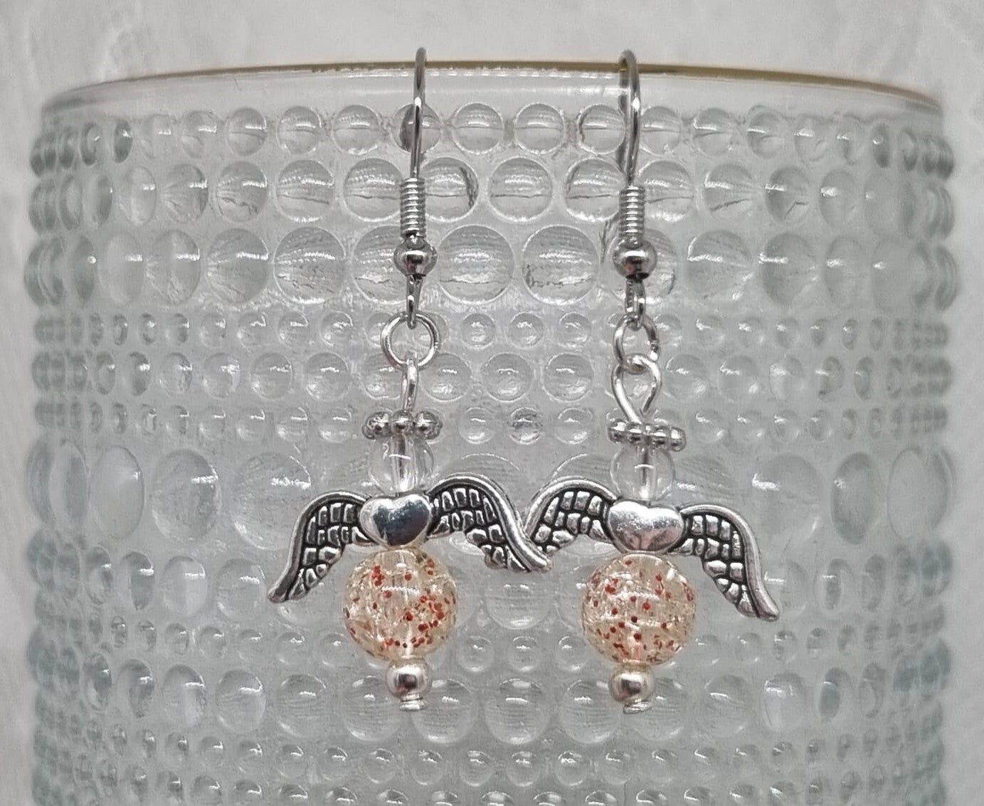 Deze oorbellen hebben geluksengeltjes met een transparante kraal met rode glitters van 8 mm. Het geluksengeltje heeft een transparant hoofdje van 4 mm en is afgewerkt met een zilverkleurig vleugeltje en oorbelhaakje.