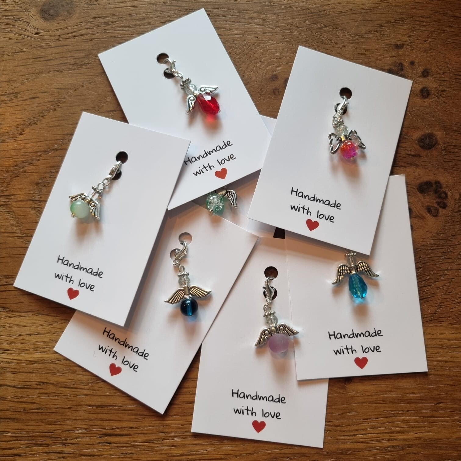 Geluksengeltje met blauwe kraal als buik en transparante kraal als hoofdje. In de blauwe kraal zit een zilvere bloem gegraveerd. Het engeltje is in zilverkleurig metaal afgewerkt.