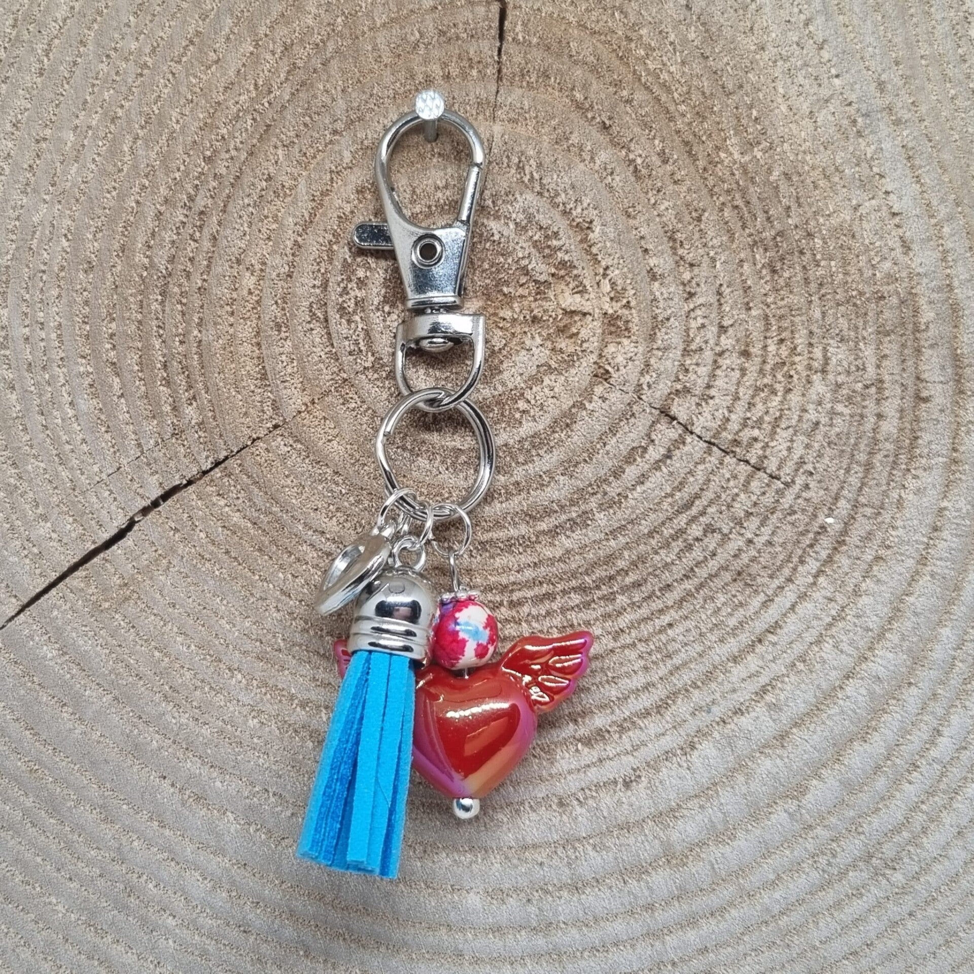 Aan dit karabijn slot hangt een ander soort geluksengeltje. Deze rode geluksengel is gemaakt van een parelmoer kraal van een hart en vleugels. Het hoofdje is van een bijpassende rood/blauwe kraal gemaakt. Aan de sleutelhanger hangt een blauwe leren kwastje en een bedel van een open hart.