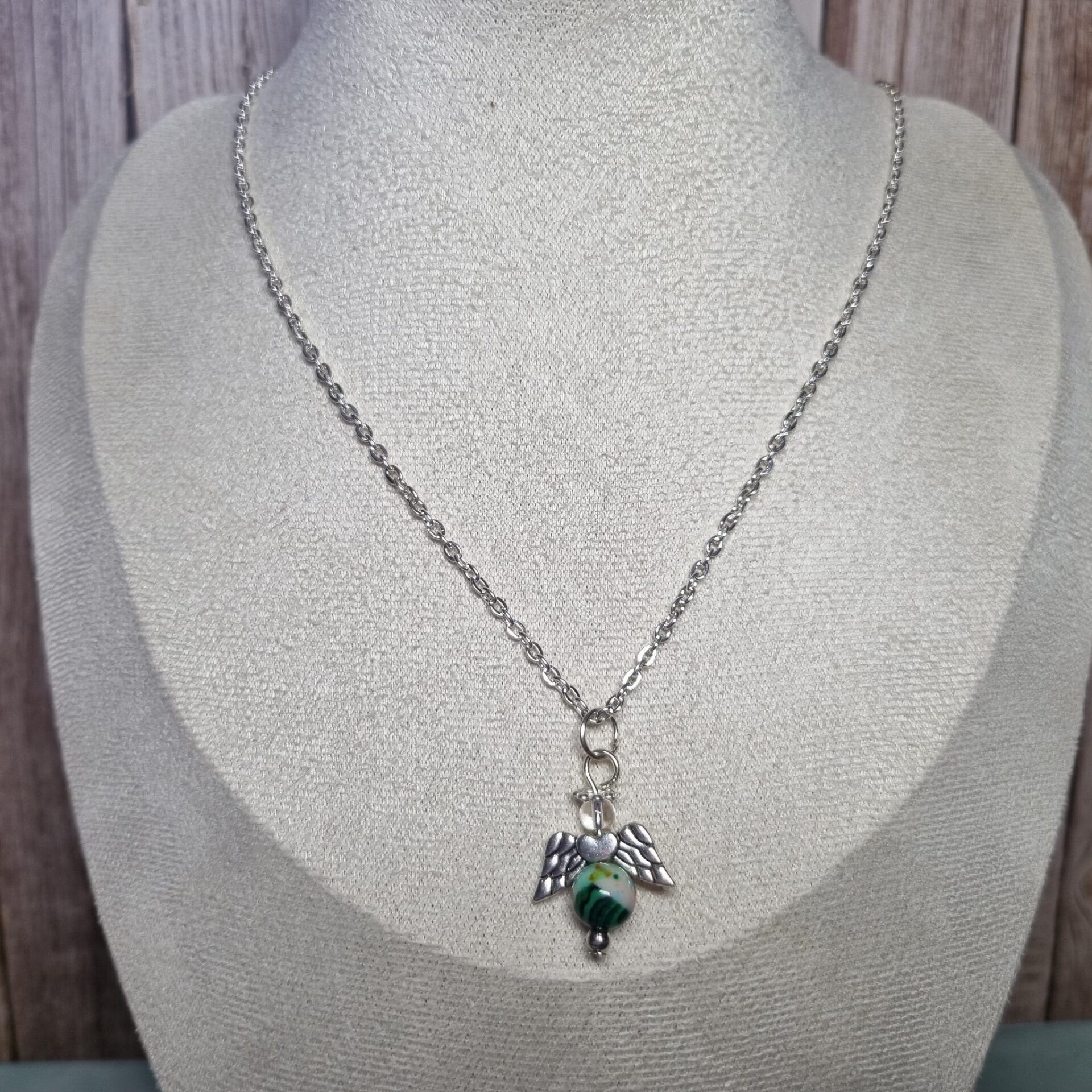 Aan deze zilverkleurige ketting hangt een geluksengeltje met een kraal in de kleuren wit, groen, licht roze, licht blauw en een vleugje bruin als buik, het hoofdje is gemaakt van een transparante kraal. De ketting is inclusief slotje ongeveer 44 cm lang en heeft een verlengkettinkje van ongeveer 5 cm eraan zodat je hem langer kunt dragen.