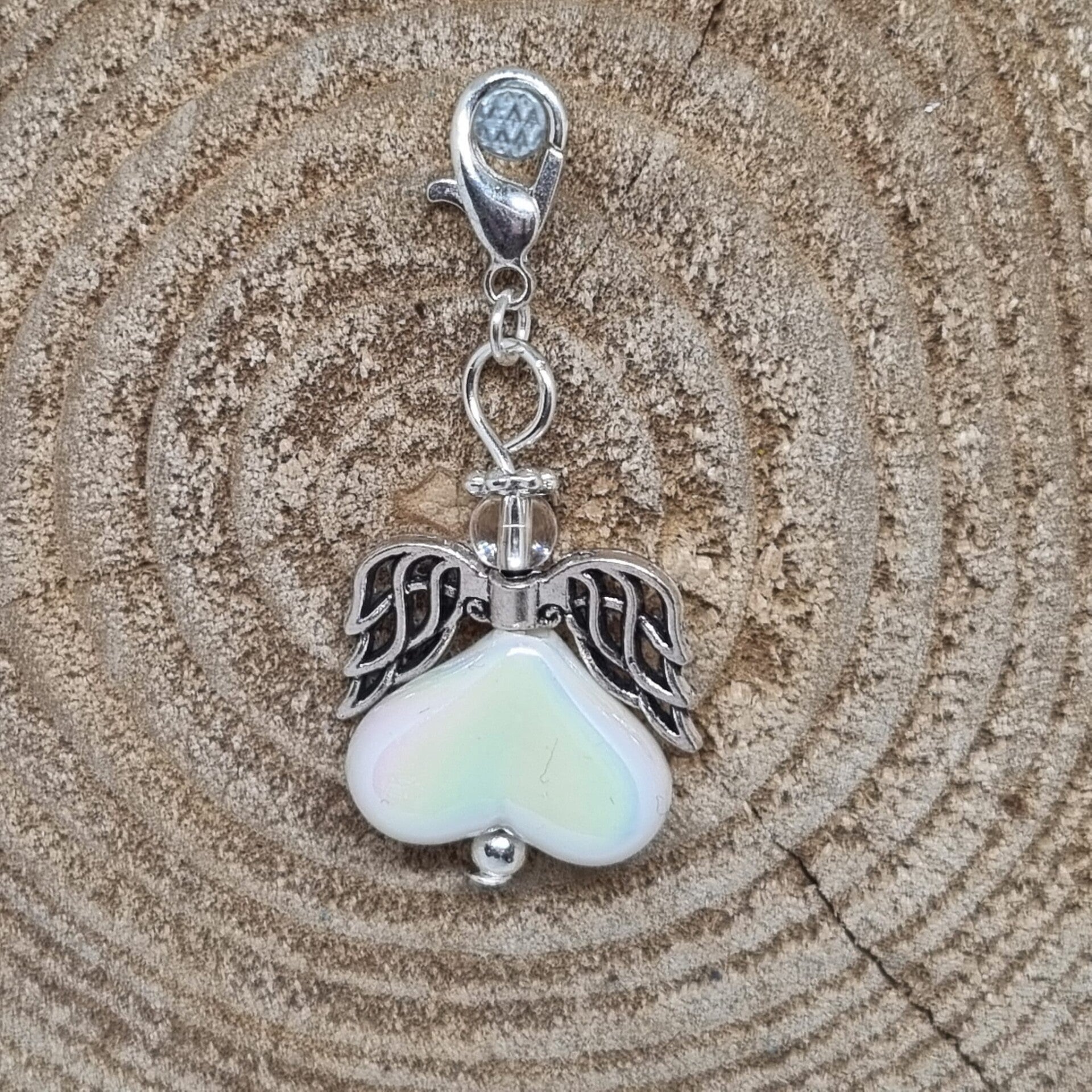 Dit geluksengeltje heeft een wit 12 x 16 mm parelmoer hartje als buik en een 4 mm tranparant kraaltje als hoofdje. Het geluksengeltje is verder afgewerkt met een zilverkleurig metalen vleugel en materiaal.