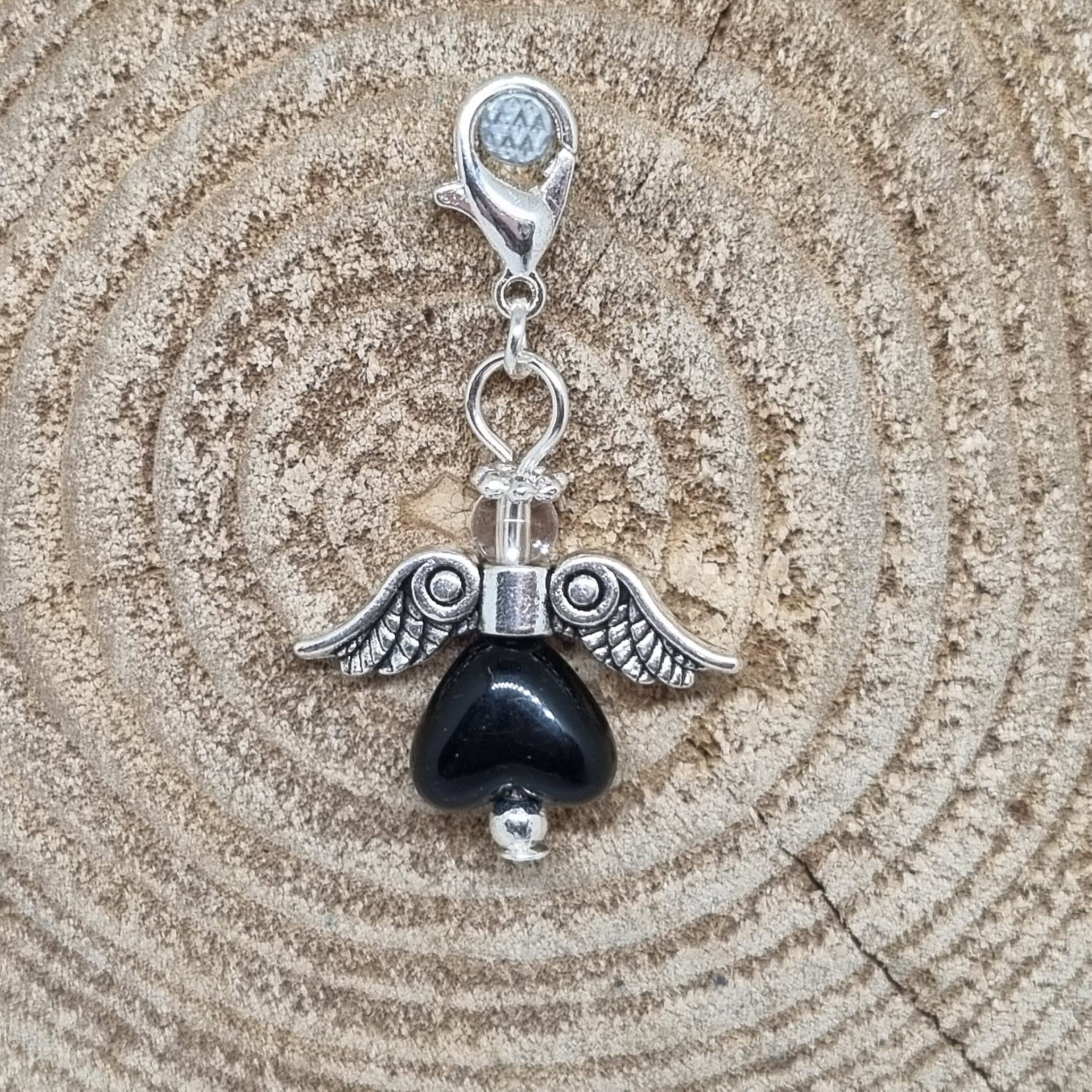 Een geluksengeltje met een glanzend rood hartje van ongeveer 9 x 11 mm als buik en een transparant kraaltje van 4 mm als hoofdje. Het geluksengeltje is verder afgewerkt met een zilverkleurig metalen vleugel en materiaal.