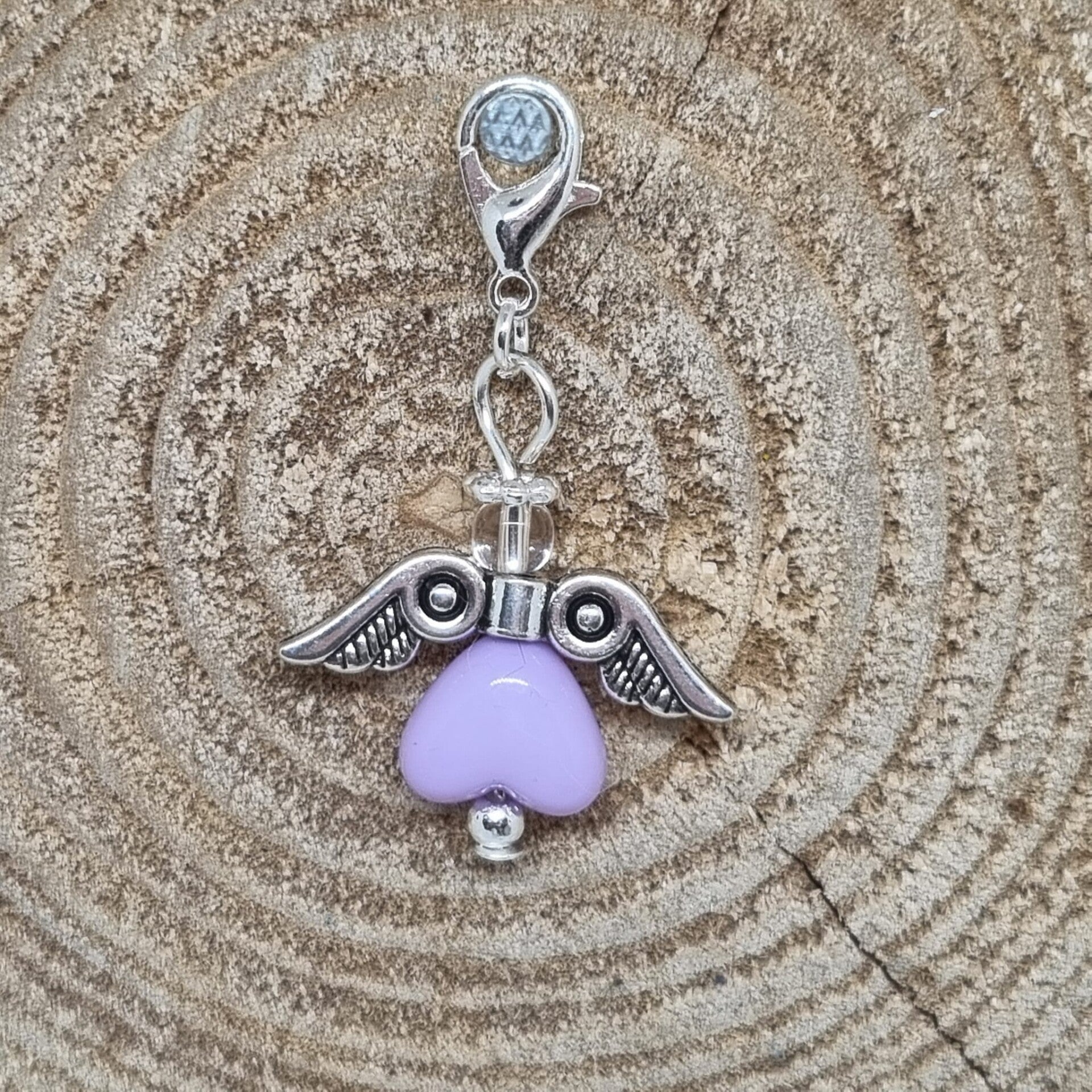 Een geluksengeltje met een glanzend lila hartje van ongeveer 9 x 11 mm als buik en een transparant kraaltje van 4 mm als hoofdje. Het geluksengeltje is verder afgewerkt met een zilverkleurig metalen vleugel en materiaal.