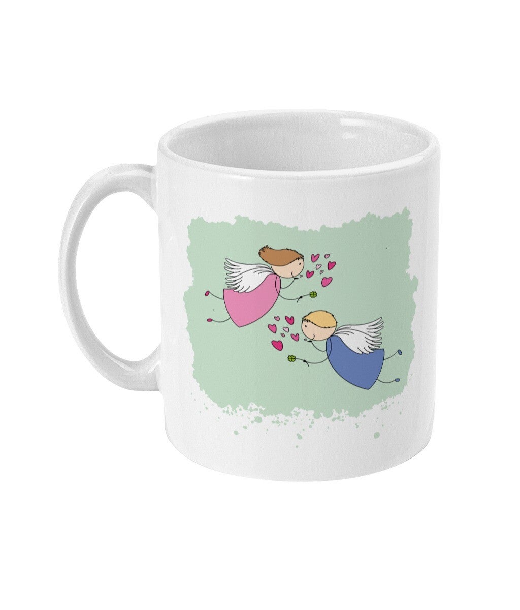 Drink jij binnenkort uit deze mok? De mok heeft aan beide kanten een mint groene kleur met aan één kant een afbeelding van twee engeltjes en aan de andere kant de tekst 'een mok vol geluk'.