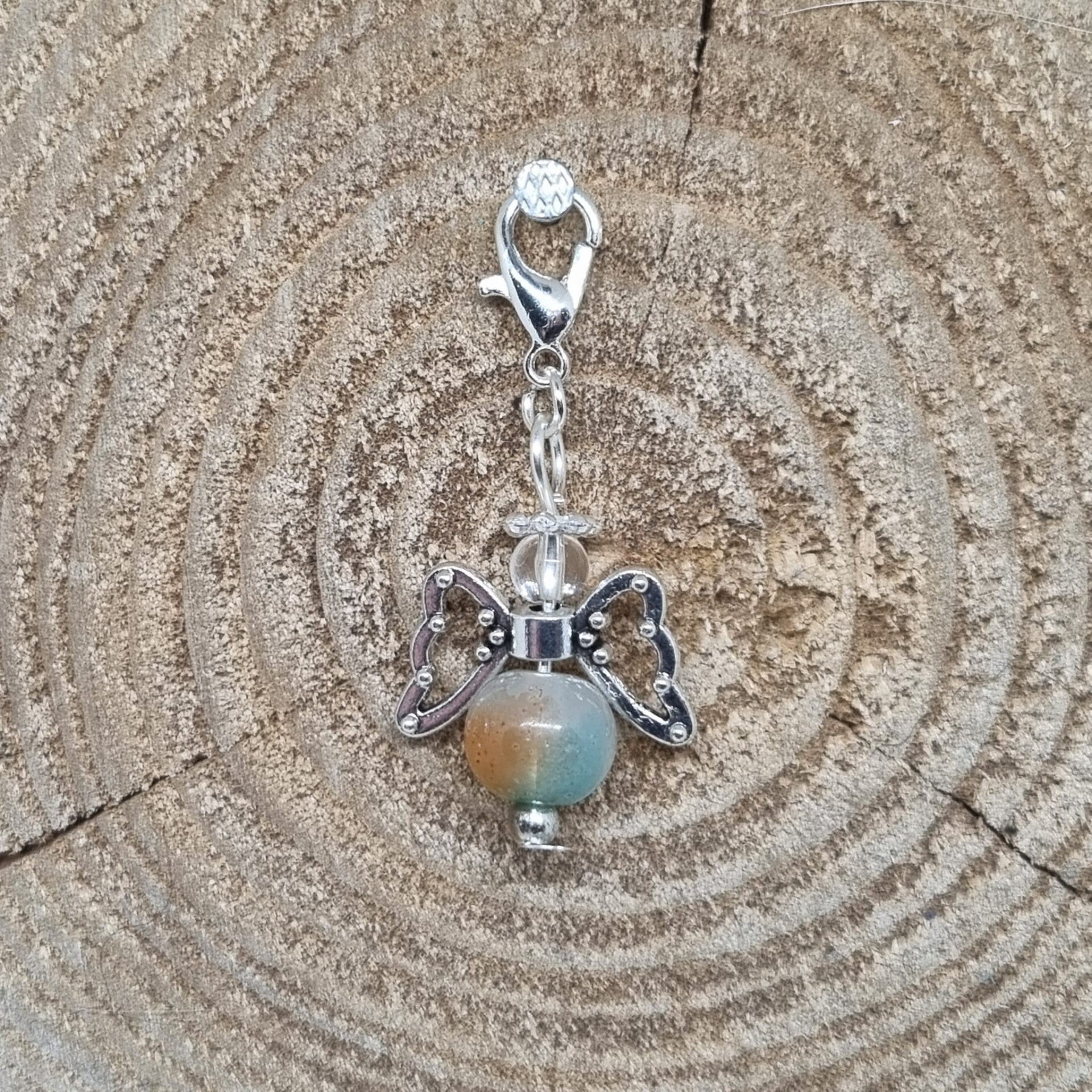 Geluksengeltje met melkglas kraal met bruine en blauwe accenten als buik en transparante kraal als hoofdje. Het engeltje is in zilverkleurig metaal afgewerkt.