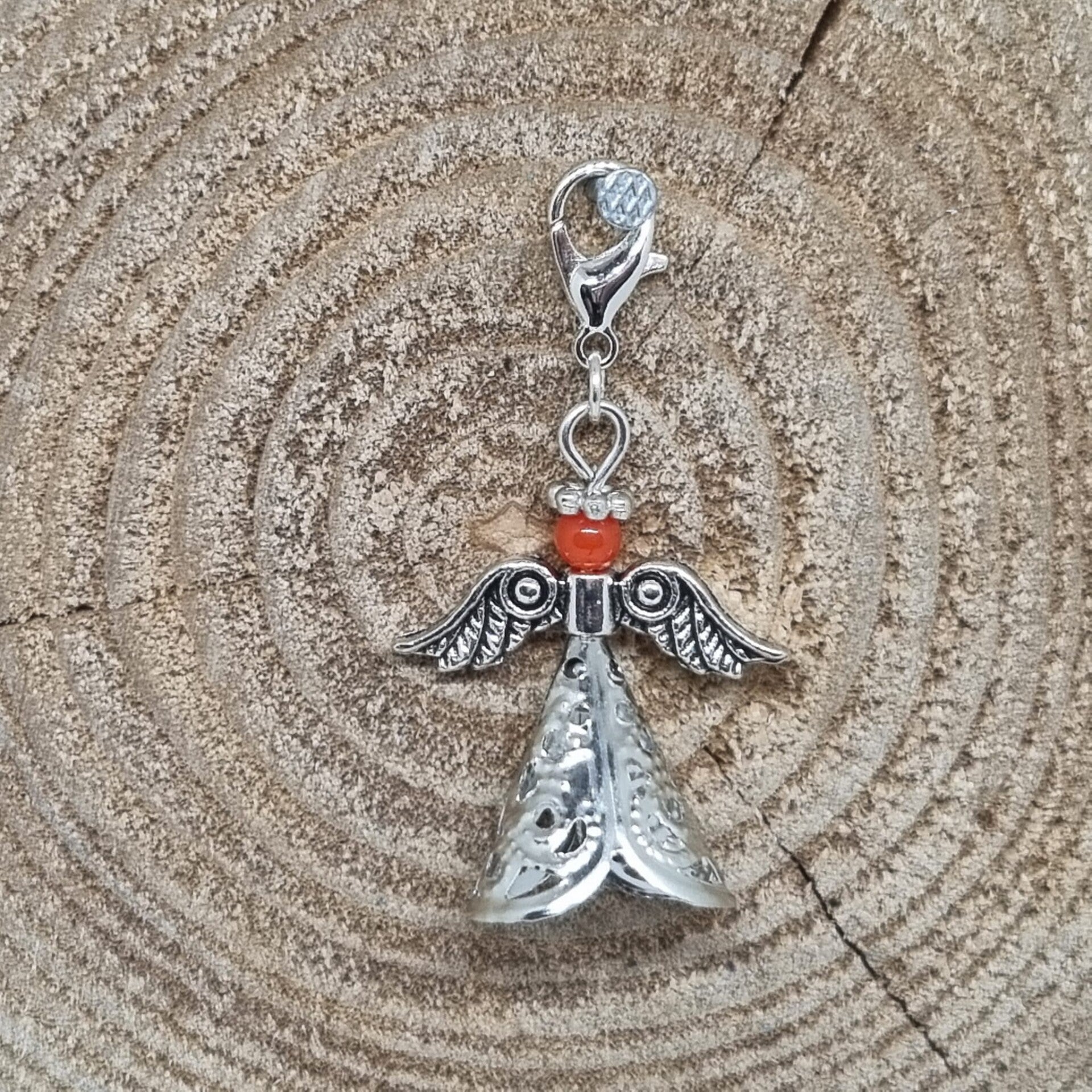 Geluksengeltje met grote opengewerkte metalen kraal als buik en een oranje kraaltje als hoofdje. Het engeltje is in zilverkleurig metaal afgewerkt.