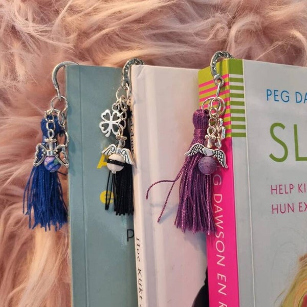 Deze metalen boekenlegger van 8,5 cm heeft een blauwe suedelook kwast, ronde bedel van het autisme logo en natuurlijk een geluksengel met een gele en rode kraal.