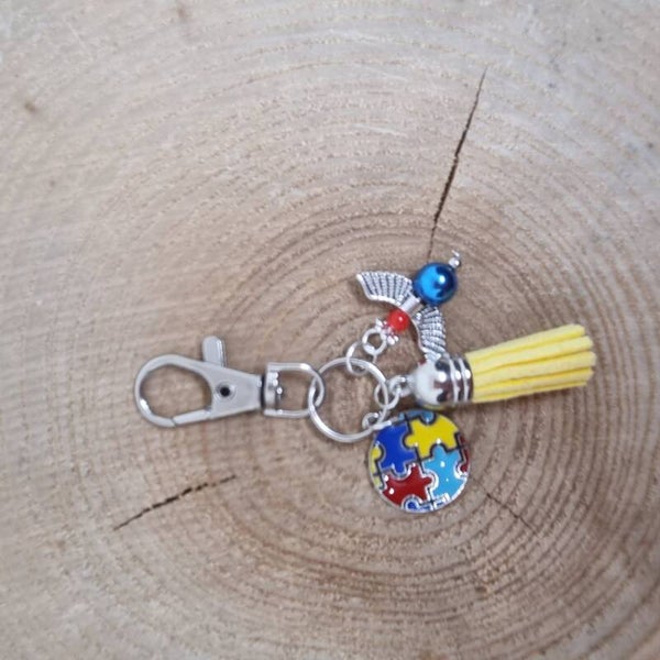 Deze sleutelhanger met karabijn heeft een leren kwastje in het geel, een bedel met het autisme logo en een geluksengeltje met blauw en rood. Het is afgewerkt in zilverkleurig metaal en de lengte is ongeveer 8,5 cm.