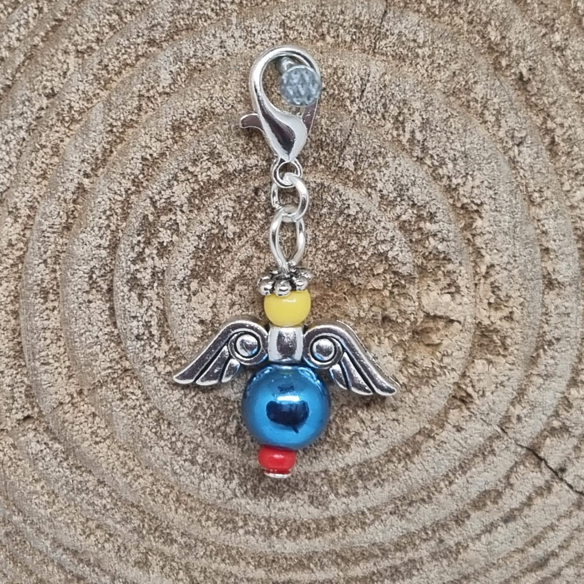 Geluksengeltje in de kleuren van het autisme logo. Het geluksengeltje heeft een mettalic blauwe kraal als buik en gele kraal als hoofdje. Het engeltje is in zilverkleurig metaal afgewerkt.