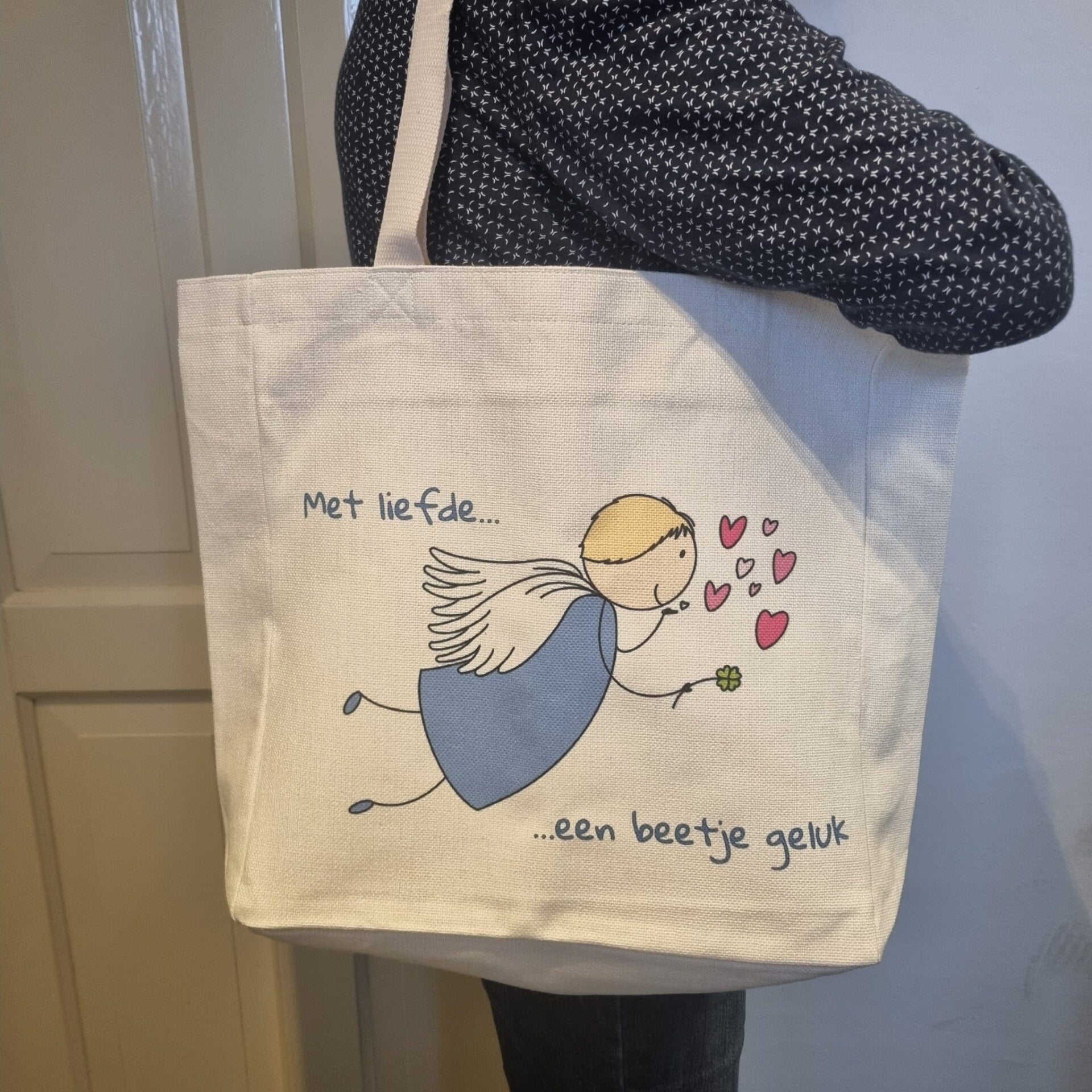Deze tas shopper met blauwe geluksengel brengt al jouw spullen veilig van A naar B. Op de tas staat de tekst "met liefde een beetje geluk".