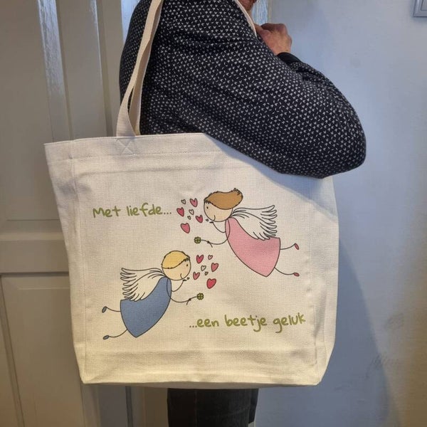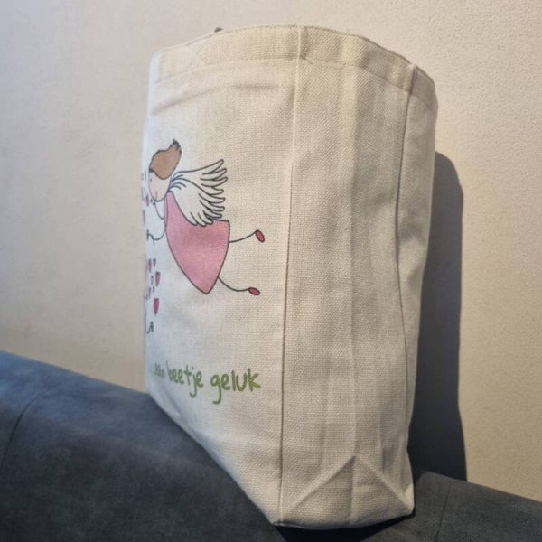 Deze tas shopper met blauwe en roze geluksengel brengt al jouw spullen veilig van A naar B. Op de tas staat de tekst "met liefde een beetje geluk".