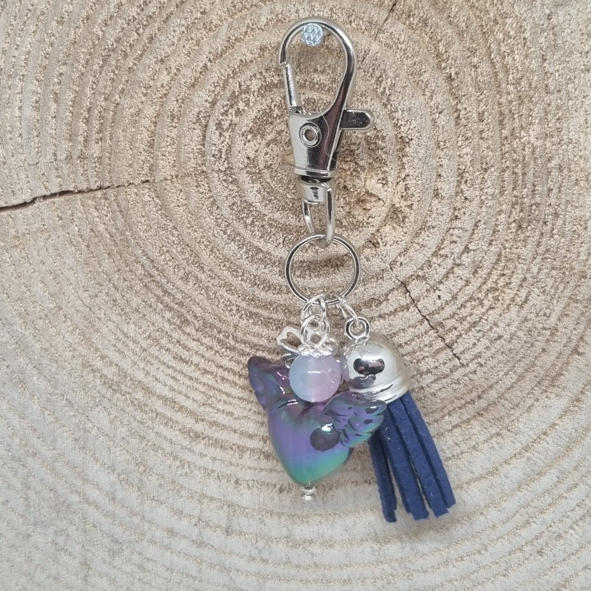 Aan dit karabijn slot hangt een ander soort geluksengeltje. Deze blauwe geluksengel is gemaakt van een transparante parelmoer kraal van een hart en vleugels. Het hoofdje is van een bijpassende blauwe met rode kraal gemaakt. Aan de sleutelhanger hangt een blauwe leren kwastje en een bedel van een klavertje vier.