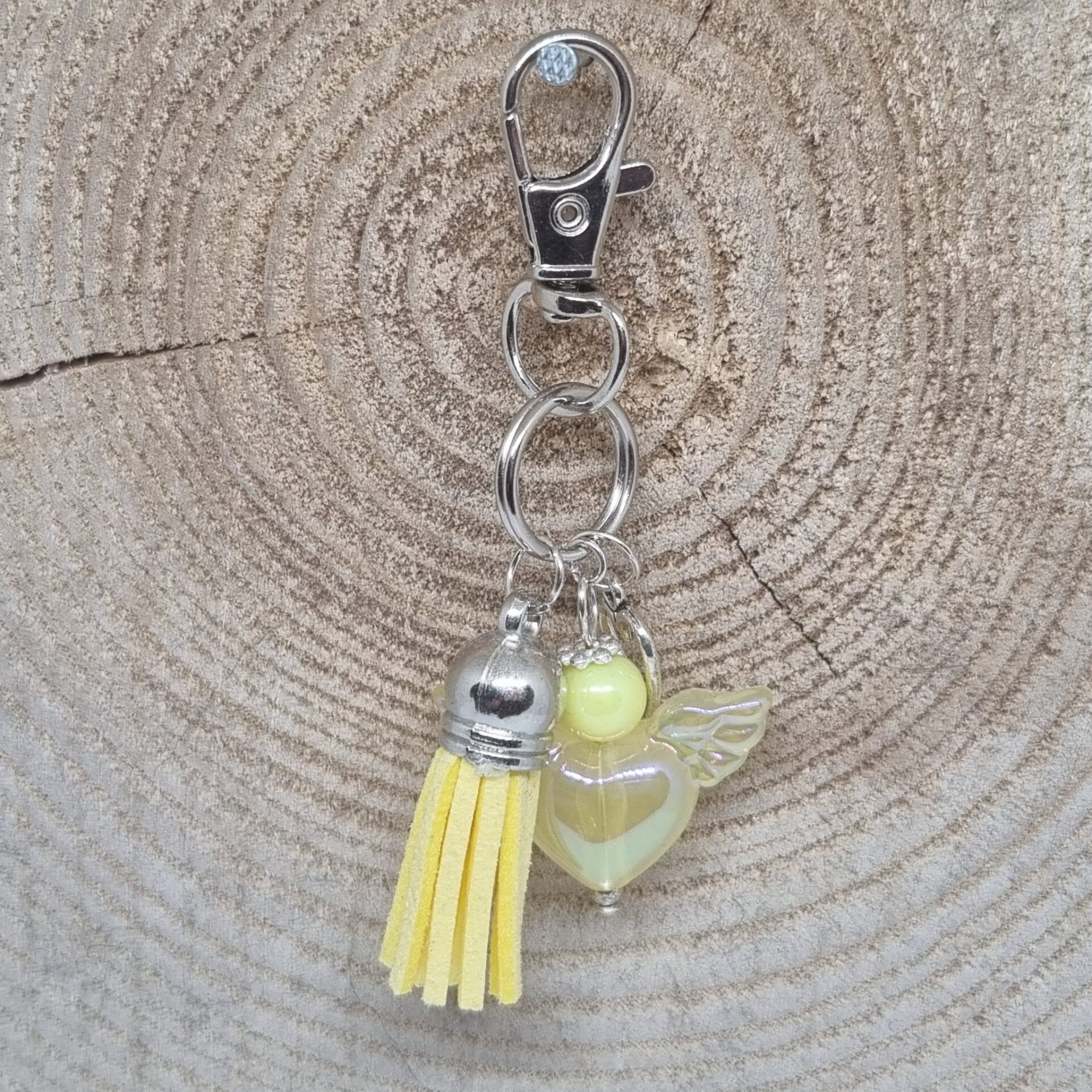 Aan dit karabijn slot hangt een ander soort geluksengeltje. Deze gele geluksengel is gemaakt van een transparante parelmoer kraal van een hart en vleugels. Het hoofdje is van een bijpassende gele kraal gemaakt. Aan de sleutelhanger hangt een gele leren kwastje en een bedel van een hartje.