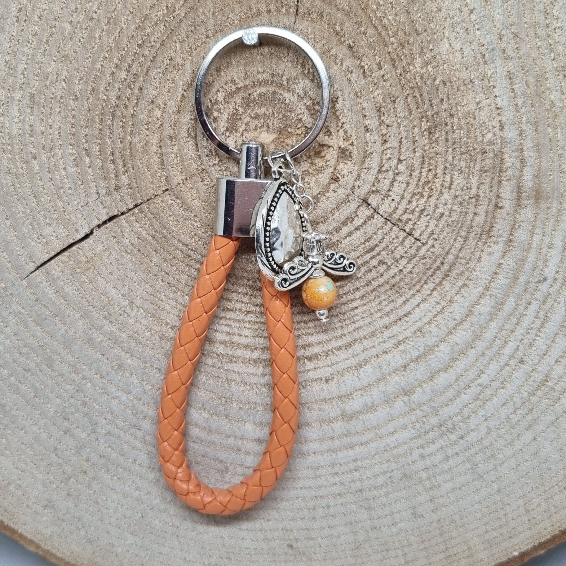 Deze sleutelhanger heeft een oranje gevlochten lus van leatherlook. Aan de sleutelhanger hangt een geluksengel met een 8 mm kraal in het oranje als buik en een transparante 4 mm kraal als hoofdje. De geluksengel is verder afgewerkt in zilverkleurig metaal. Een bedel van een druppel maakt de sleutelhanger helemaal af.