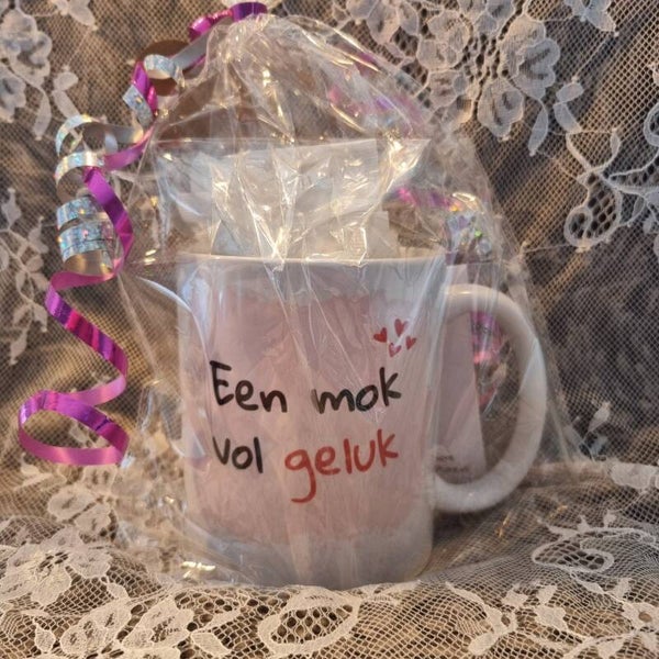 In dit leuke gelukspakket zit een witte mok met roze vlak waarop een geluksengeltje staat in het wit met zwart. Op de achterkant van de mok staat de teskt: Een mok vol geluk. In de mok zitten 5 zakjes geluksthee, de thee is een groene/zwarte thee met rozenblaadjes, korenbloem en suikervlinders. En natuurlijk kan er in het pakket geen bijpassend geluksengeltje ontbreken.