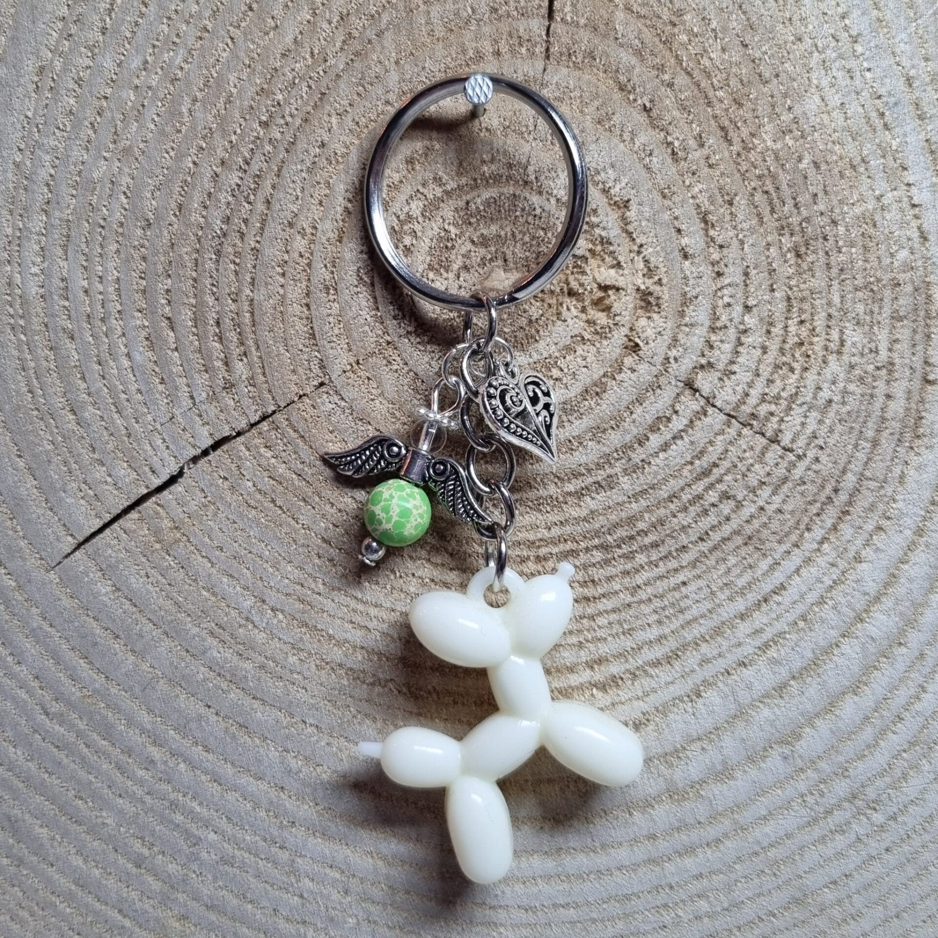 Deze sleutelhanger met creme ballonhond heeft een bijpassende geluksengel gemaakt van een beige en groene kraal als buik en een transparante kraal als hoofdje. Het geluksengeltjes is verder afgewerkt in zilverkleurig metaal. Aan de sleutelhanger hangt een hartjes bedel.