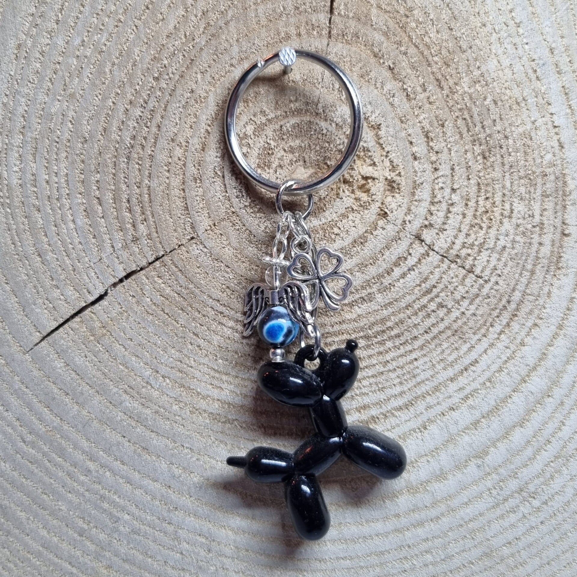 Deze sleutelhanger met zwarte ballonhond heeft een bijpassende geluksengel gemaakt van een zwarte met blauw kraal als buik en een transparante kraal als hoofdje. Het geluksengeltjes is verder afgewerkt in zilverkleurig metaal. Aan de sleutelhanger hangt een klavertje vier bedel.