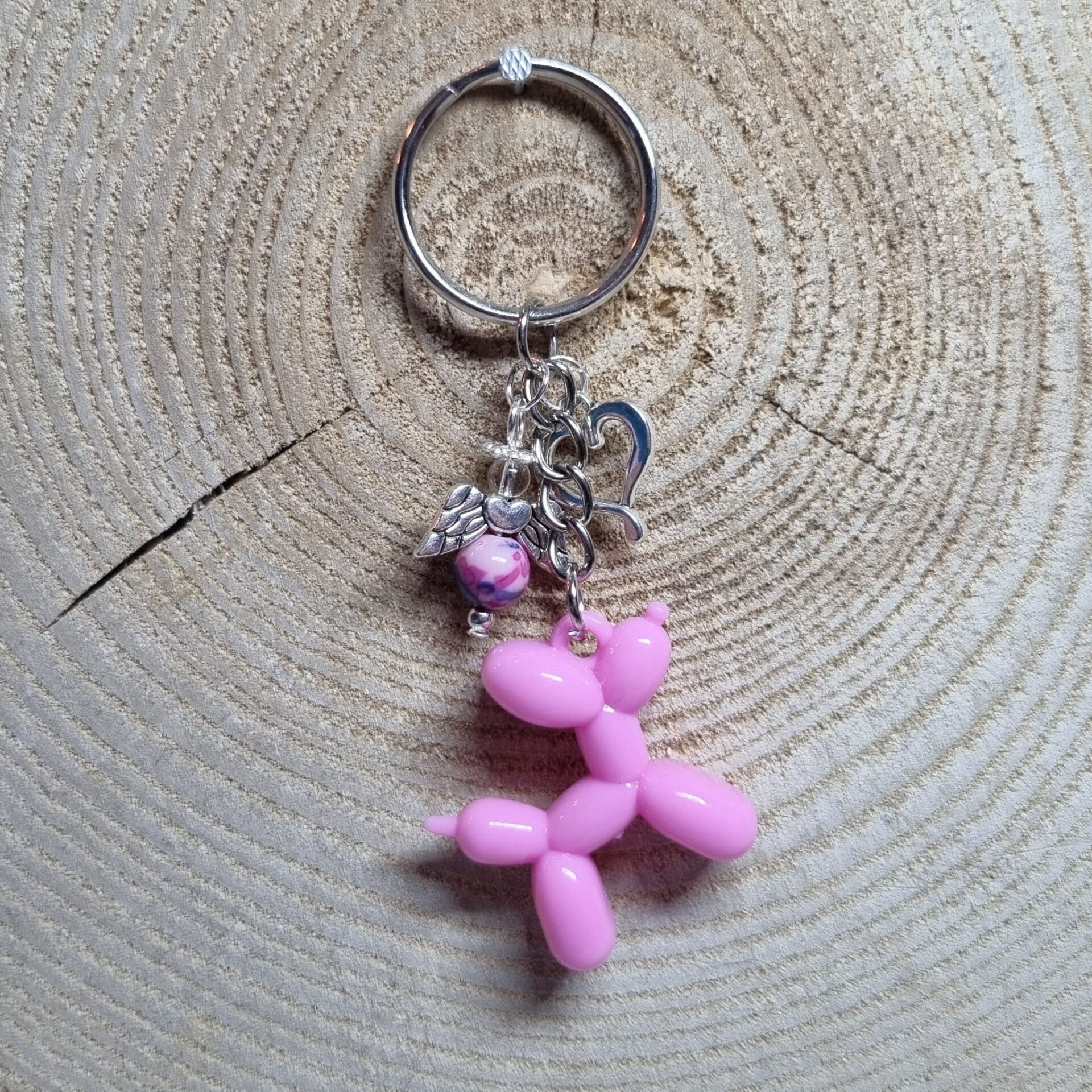 Deze sleutelhanger met roze ballonhond heeft een bijpassende geluksengel gemaakt van een roze met paarse kraal als buik en een transparante kraal als hoofdje. Het geluksengeltjes is verder afgewerkt in zilverkleurig metaal. Aan de sleutelhanger hangt een hartjes bedel.
