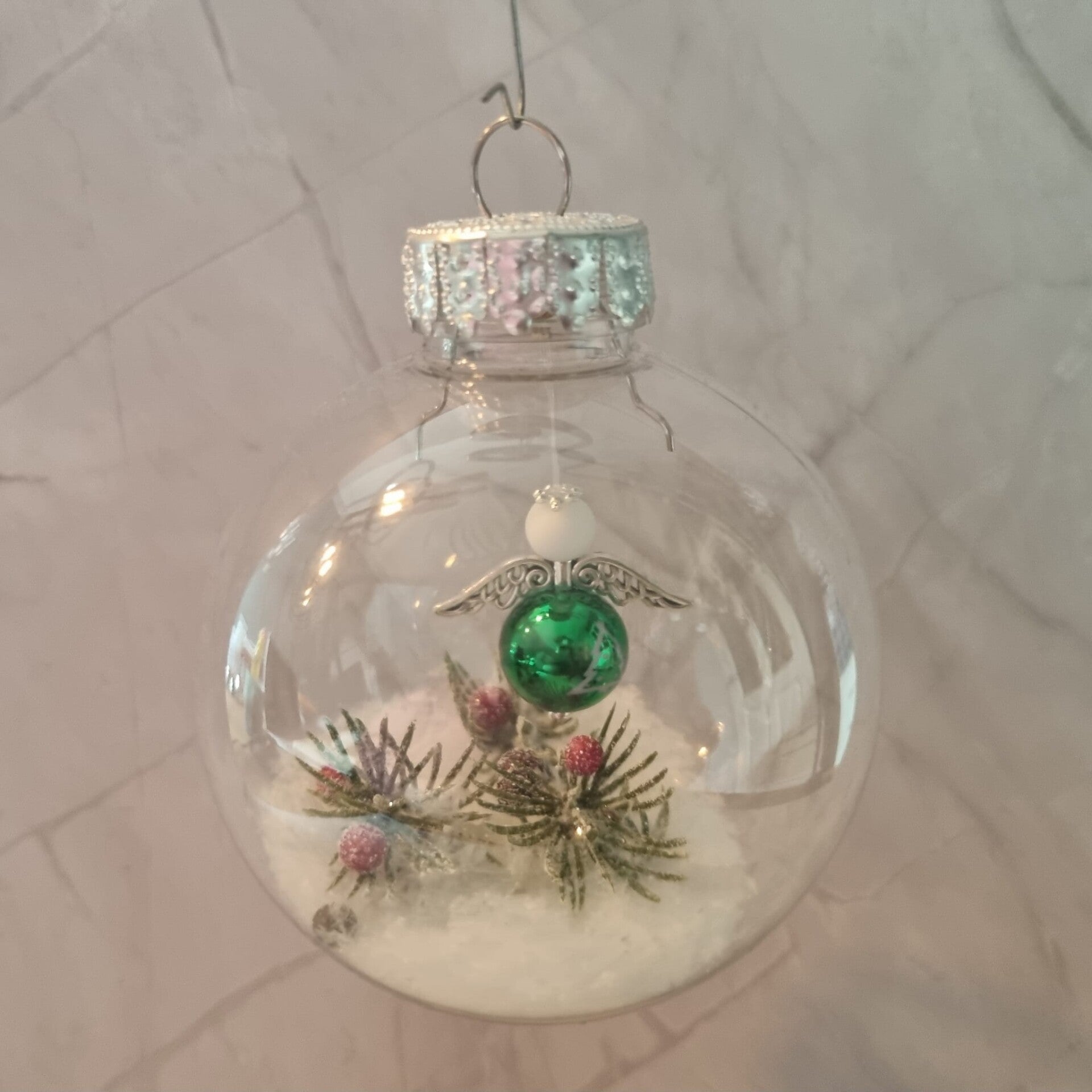 In de kerstbal zit (nep)sneeuw met kerstgroen en takjes met rode besjes.