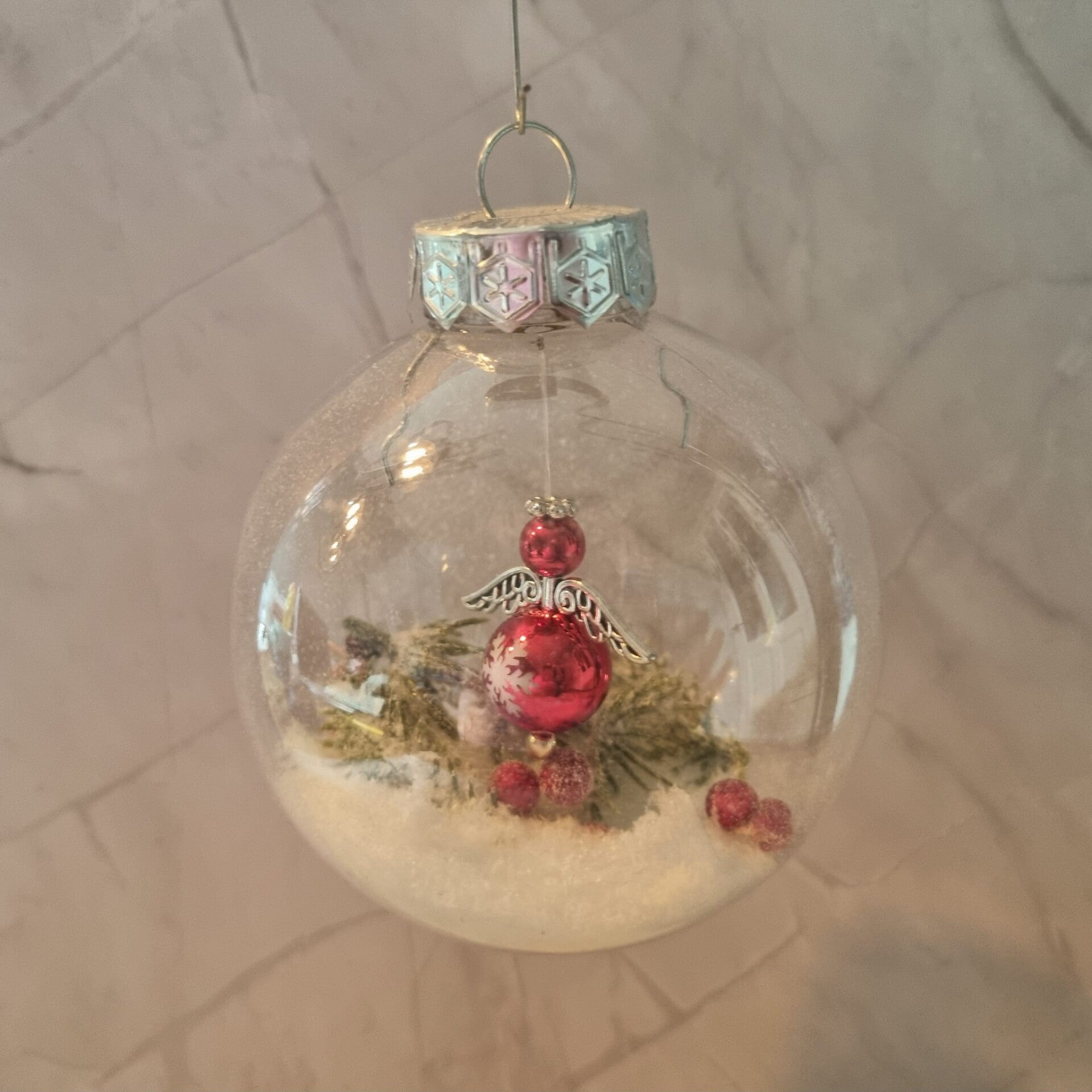 In de kerstbal zit (nep)sneeuw met kerstgroen en takjes met rode besjes.
