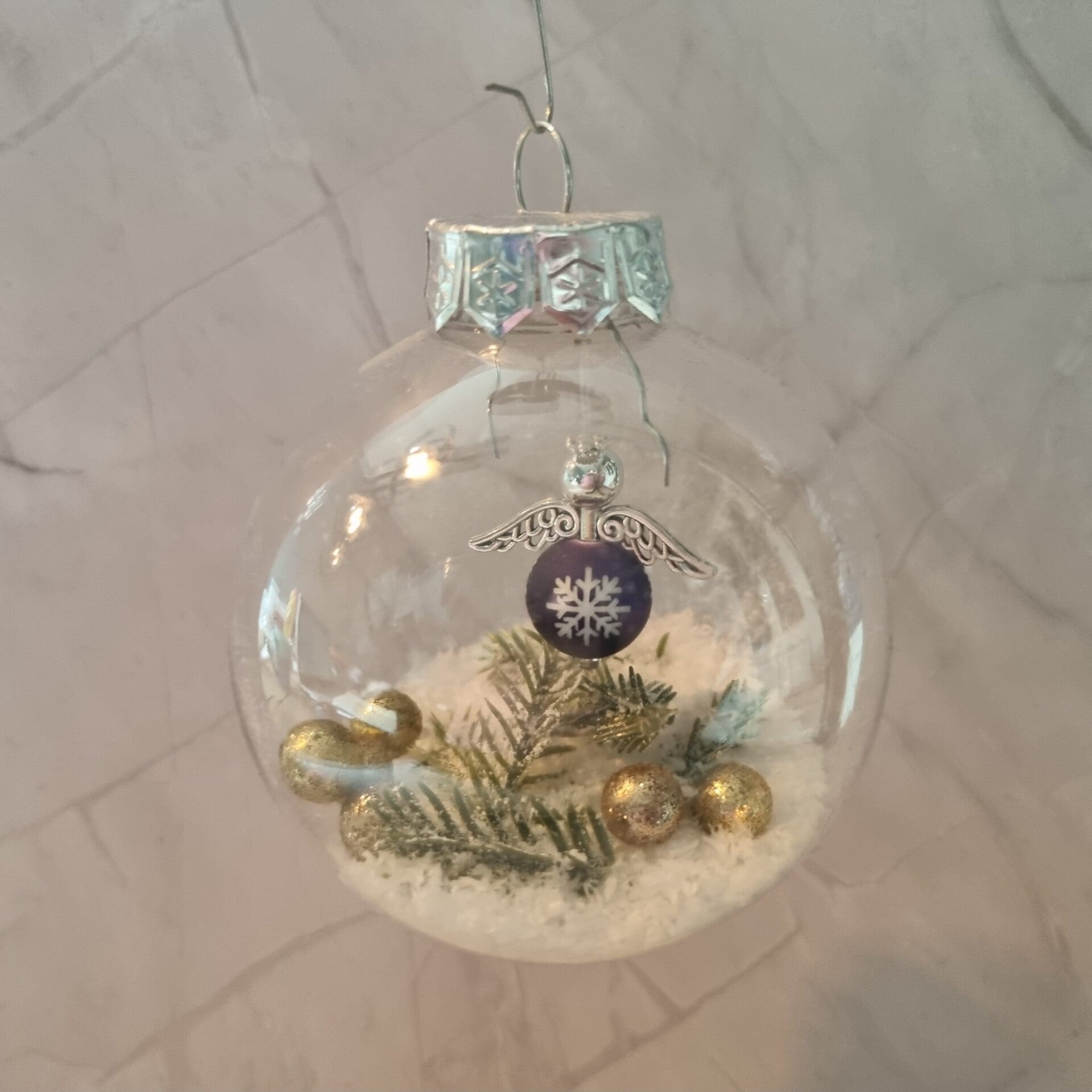 In de kerstbal zit (nep)sneeuw met kerstgroen en gouden glitter balletjes.