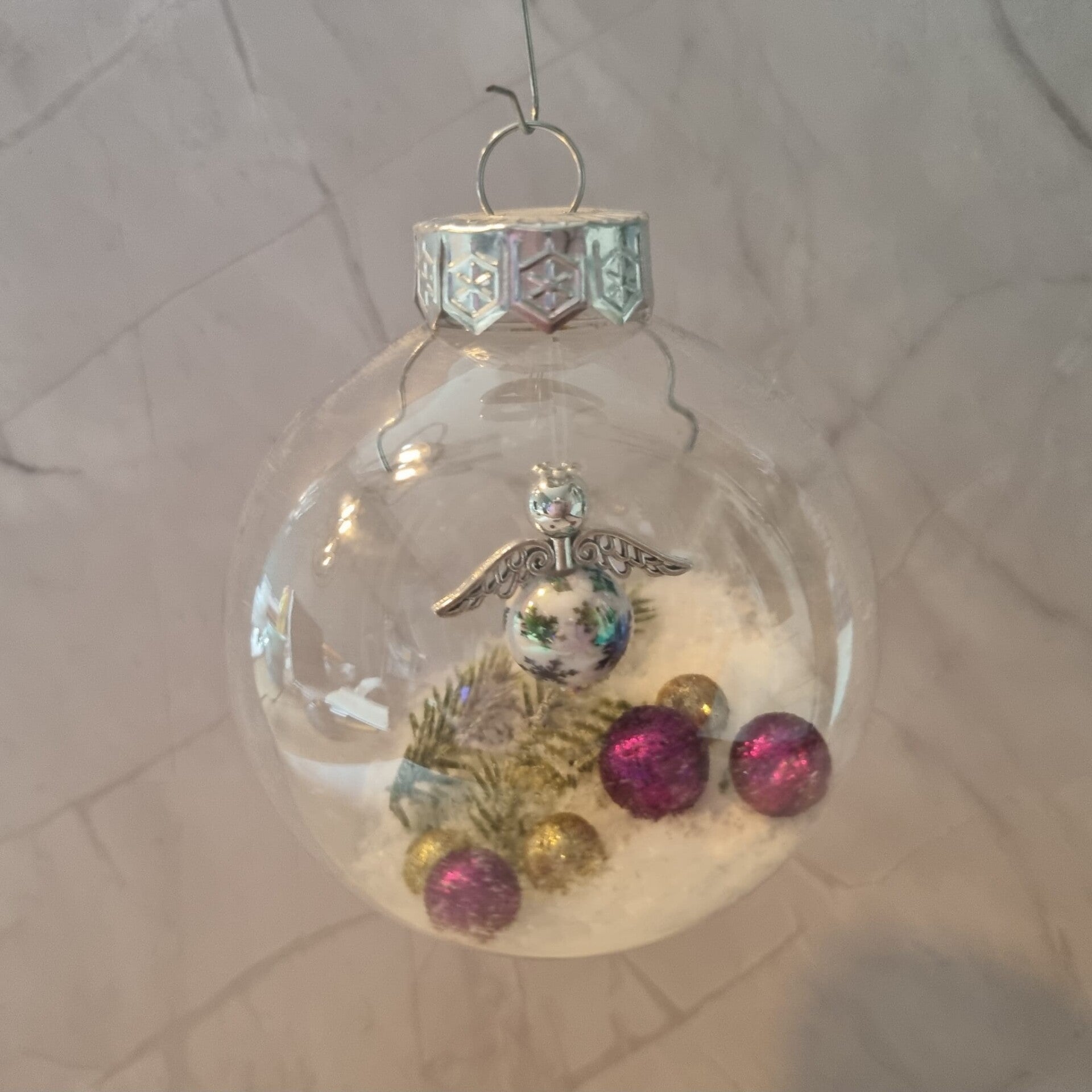 In de kerstbal zit (nep)sneeuw met kerstgroen en gouden fuchsia glitter balletjes.