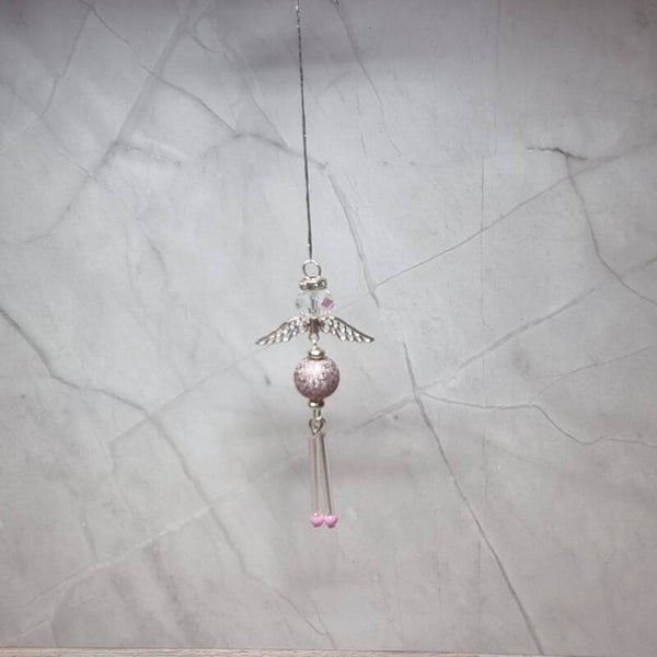 Het kerstgeluksengeltje is 7,5 cm lang en heeft een facet kraal als hoofd van 8 x 10 mm met een AB coating voor een mooie glinstering. Het lijfje is gemaakt van een zilverkleurige metalen vleugel van ruim 3 cm breed en roze glitterkraal van 12 mm.