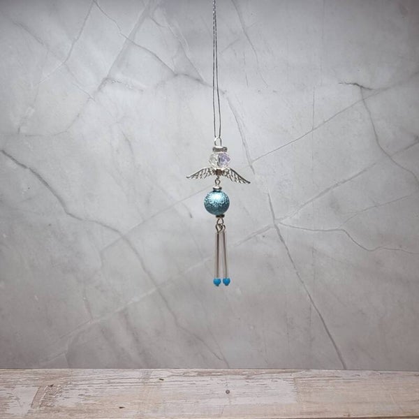 Het kerstgeluksengeltje is 7,5 cm lang en heeft een facet kraal als hoofd van 8 x 10 mm met een AB coating voor een mooie glinstering. Het lijfje is gemaakt van een zilverkleurige metalen vleugel van ruim 3 cm breed en blauwe glitterkraal van 12 mm.