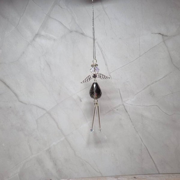 Het kerstgeluksengeltje is 7,5 cm lang en heeft een facet kraal als hoofd van 8 x 10 mm met een AB coating voor een mooie glinstering. Het lijfje is gemaakt van een zilverkleurige metalen vleugel van ruim 3 cm breed en zwart/paarse druppel facetkraal in 14 x 18 mm. Ook deze kraal heeft een AB coating en zorgt voor nog meer glinsering in je boom.