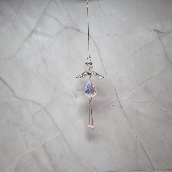 Het kerstgeluksengeltje is 7,5 cm lang en heeft een facet kraal als hoofd van 8 x 10 mm met een AB coating voor een mooie glinstering. Het lijfje is gemaakt van een zilverkleurige metalen vleugel van ruim 3 cm breed en transparante druppel facetkraal in 14 x 18 mm. Ook deze kraal heeft een AB coating en zorgt voor nog meer glinsering in je boom.