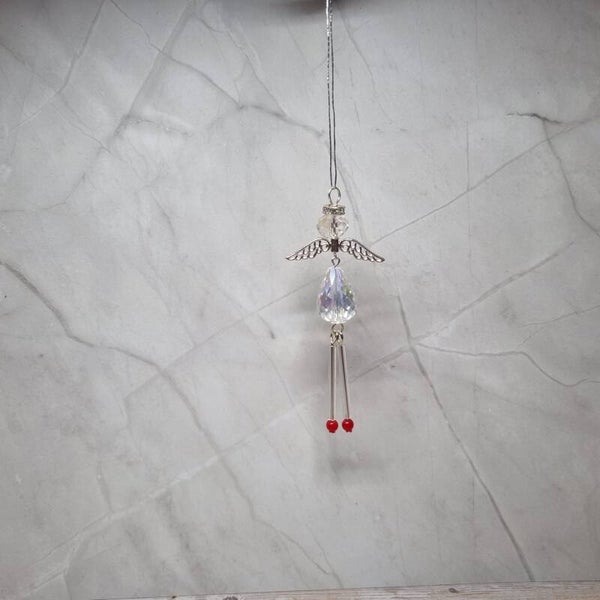 Het kerstgeluksengeltje is 7,5 cm lang en heeft een facet kraal als hoofd van 8 x 10 mm met een AB coating voor een mooie glinstering. Het lijfje is gemaakt van een zilverkleurige metalen vleugel van ruim 3 cm breed en transparante druppel facetkraal in 14 x 18 mm. Ook deze kraal heeft een AB coating en zorgt voor nog meer glinsering in je boom.