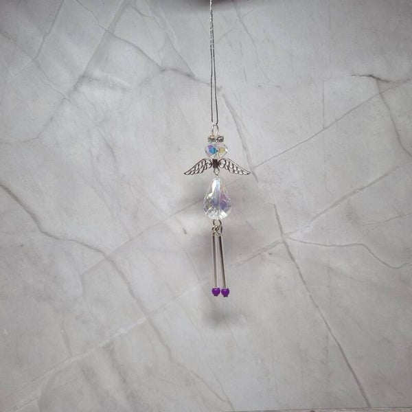 Het kerstgeluksengeltje is 7,5 cm lang en heeft een facet kraal als hoofd van 8 x 10 mm met een AB coating voor een mooie glinstering. Het lijfje is gemaakt van een zilverkleurige metalen vleugel van ruim 3 cm breed en transparante druppel facetkraal in 14 x 18 mm. Ook deze kraal heeft een AB coating en zorgt voor nog meer glinsering in je boom.