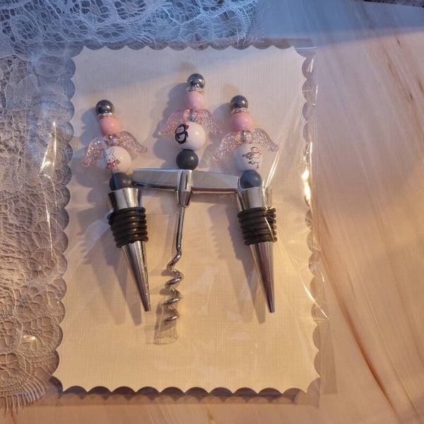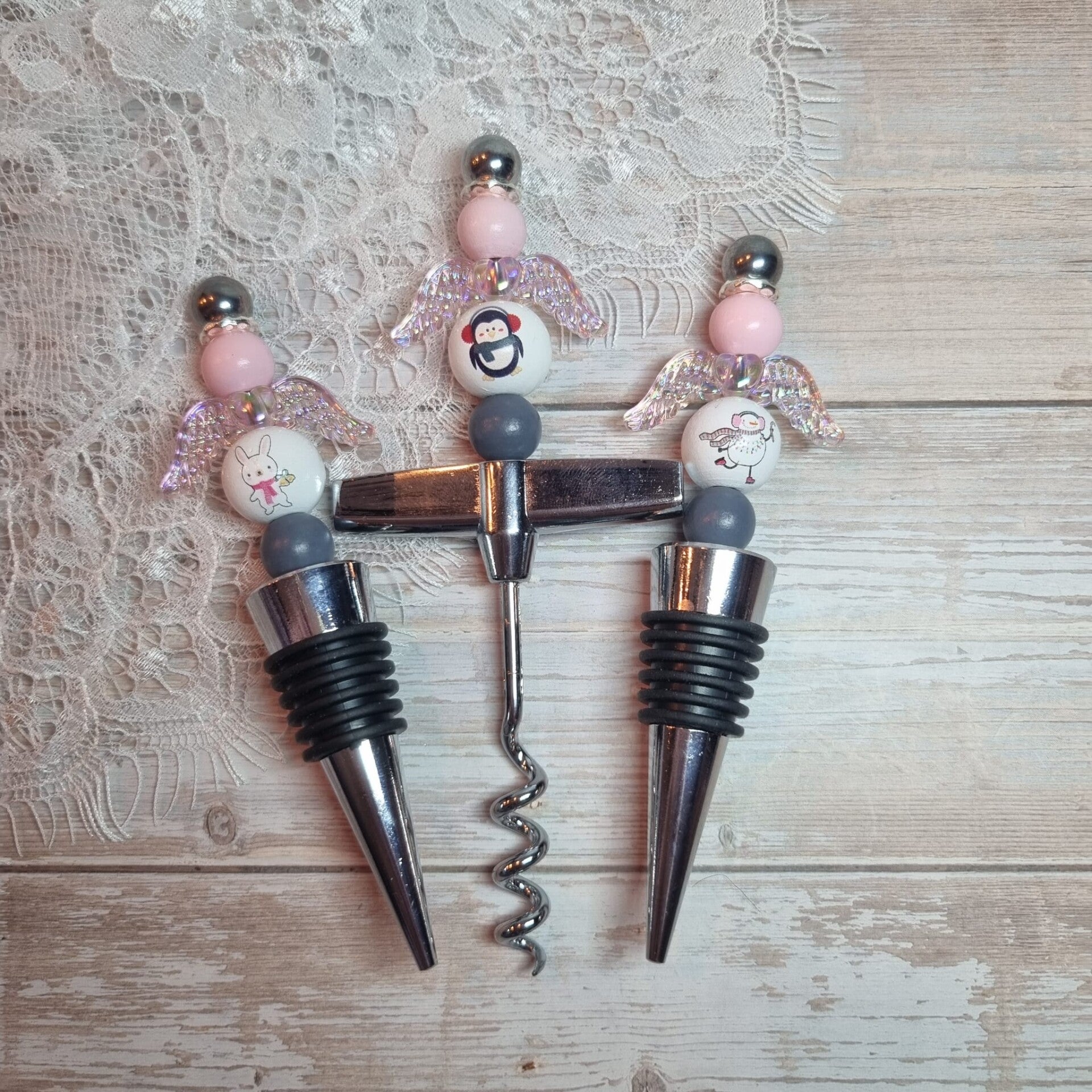 Deze wijnset bestaat uit 2 wijnflesstoppers en een kurkentrekker. De set is gemaakt van dezelfde kralen zodat er een mooie eenheid ontstaat op jouw tafel.