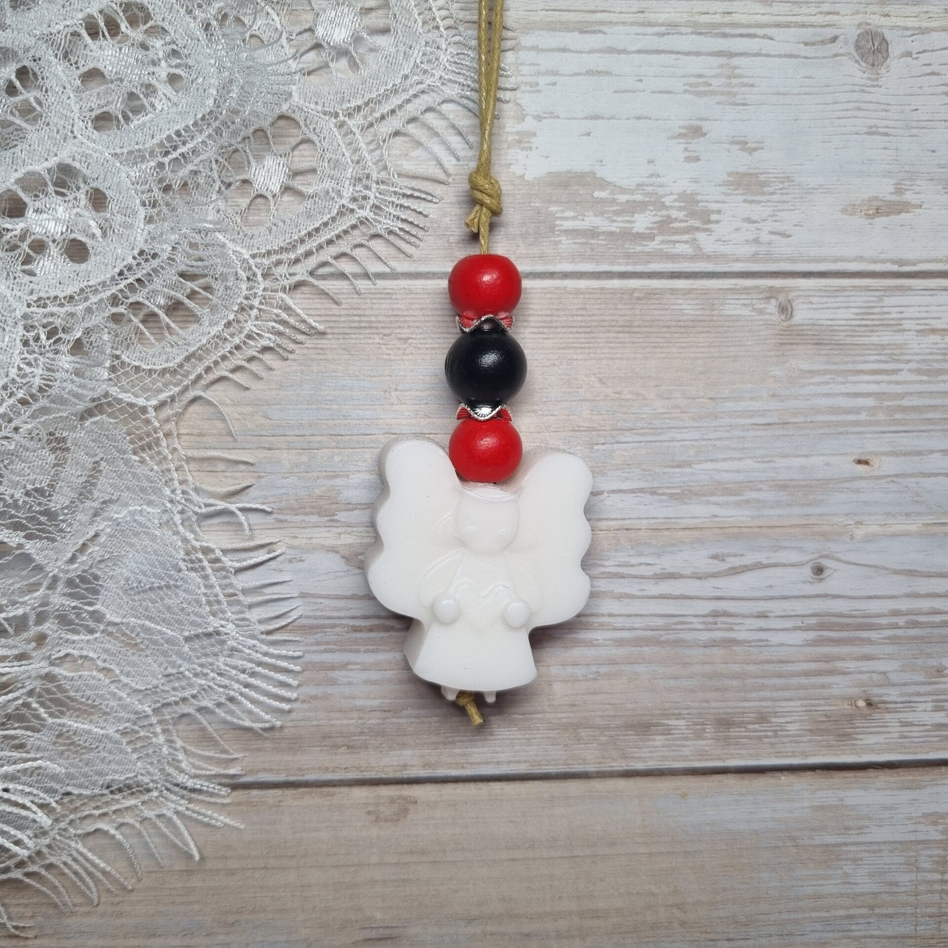Deze zeepketting is gemaakt van een wit zeepje in de vorm van een engeltje. Het heeft houten kralen met metalen kralen ertussen en is geregen op een licht bruin waxkoord touwtje.