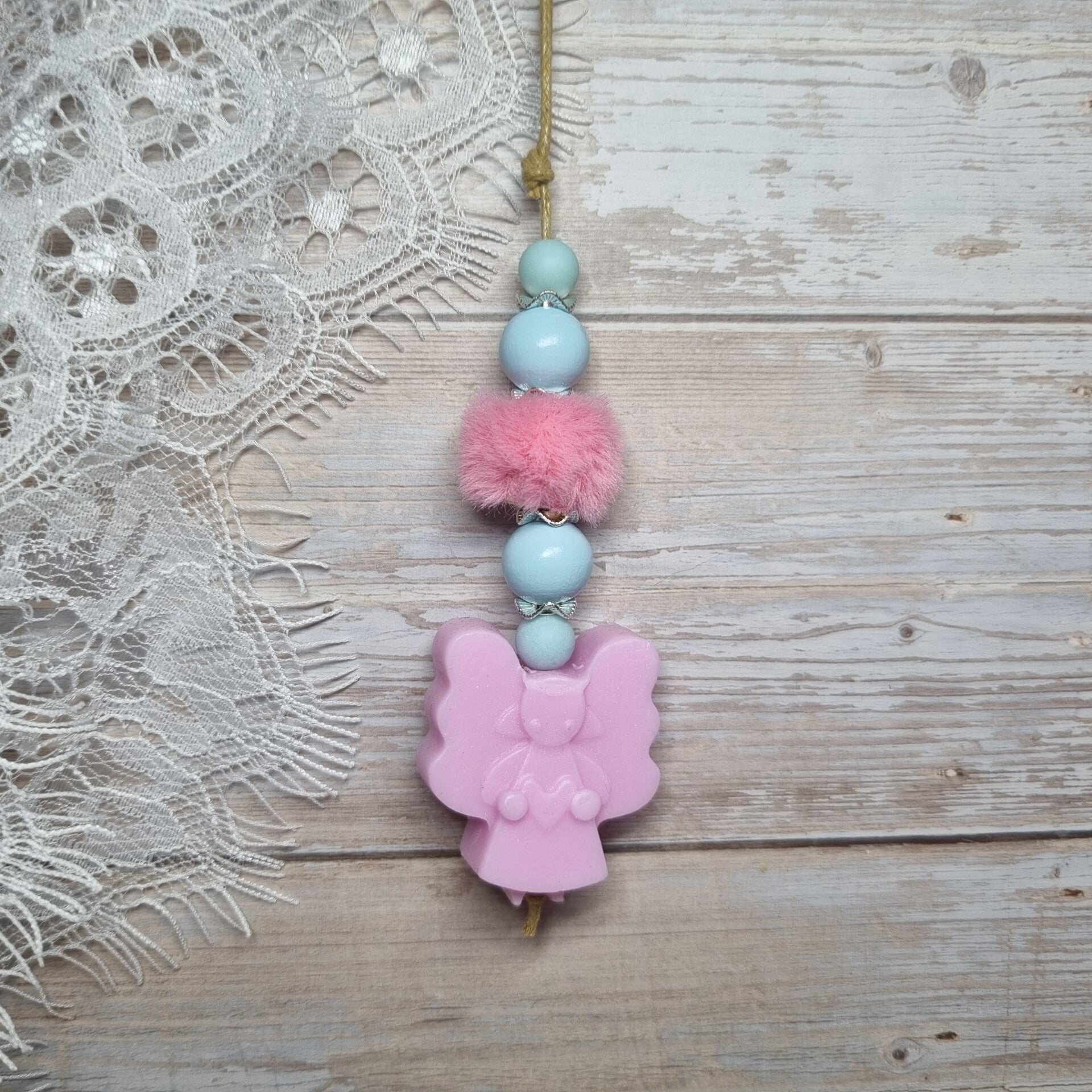Deze zeepketting is gemaakt van een roze zeepje in de vorm van een engeltje. Het heeft houten kralen met metalen kralen ertussen en in het midden een fluffy kraal. Het is geregen op een licht bruin waxkoord touwtje.
