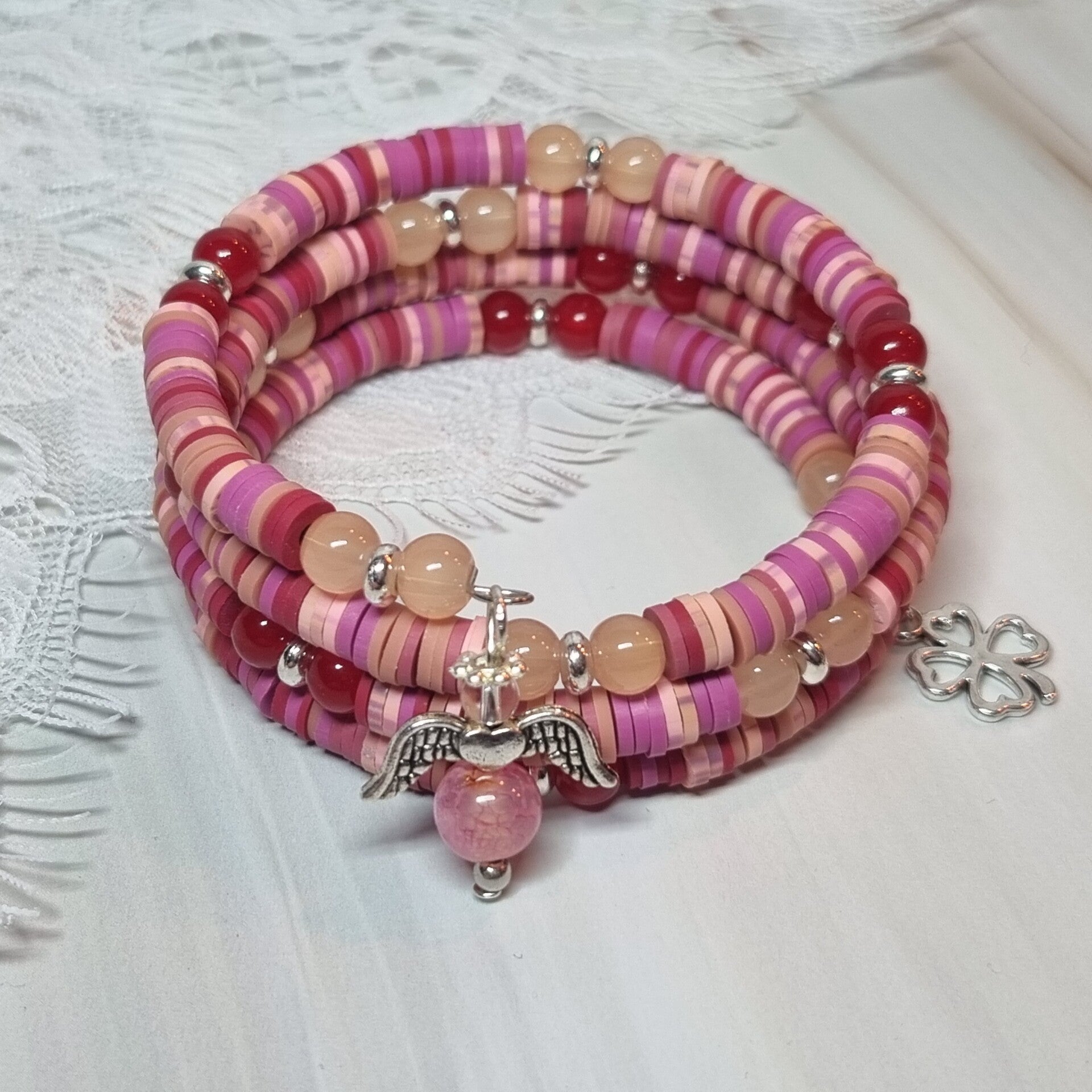 De armband heeft allerlei kraaltjes in donker beige, donker rood, zalm, donker fuchsia en metaal. Aan de armband hangt een geluksengeltje en aan de andere kant hangt een bedel van een klavertje vier.