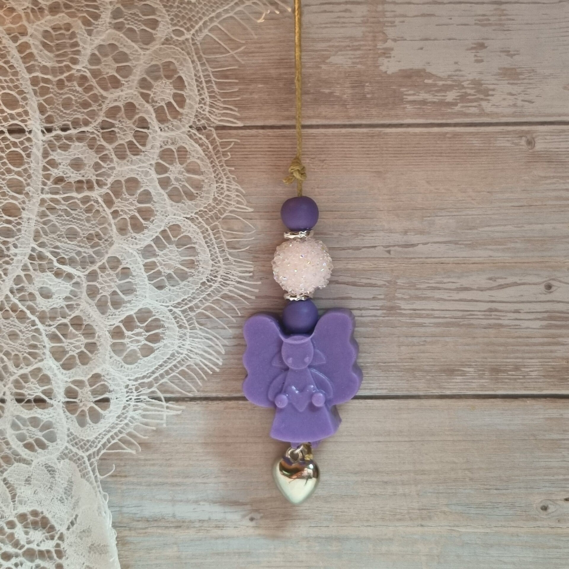 Deze zeepketting is gemaakt van een paars zeepje in de vorm van een engeltje. Het heeft houten kralen met metalen kralen ertussen en in het midden een grote glitterkraal. Het is geregen op een licht bruin waxkoord touwtje en heeft een bedel aan de onderkant hangen.