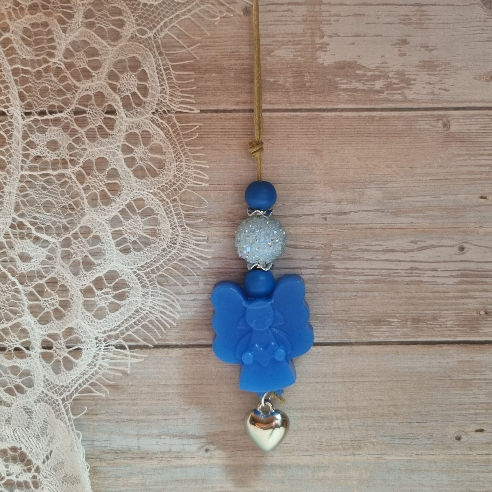 Deze zeepketting is gemaakt van een donker blauw zeepje in de vorm van een engeltje. Het heeft houten kralen met metalen kralen ertussen en in het midden een grote glitterkraal. Het is geregen op een licht bruin waxkoord touwtje en heeft een bedel aan de onderkant hangen.