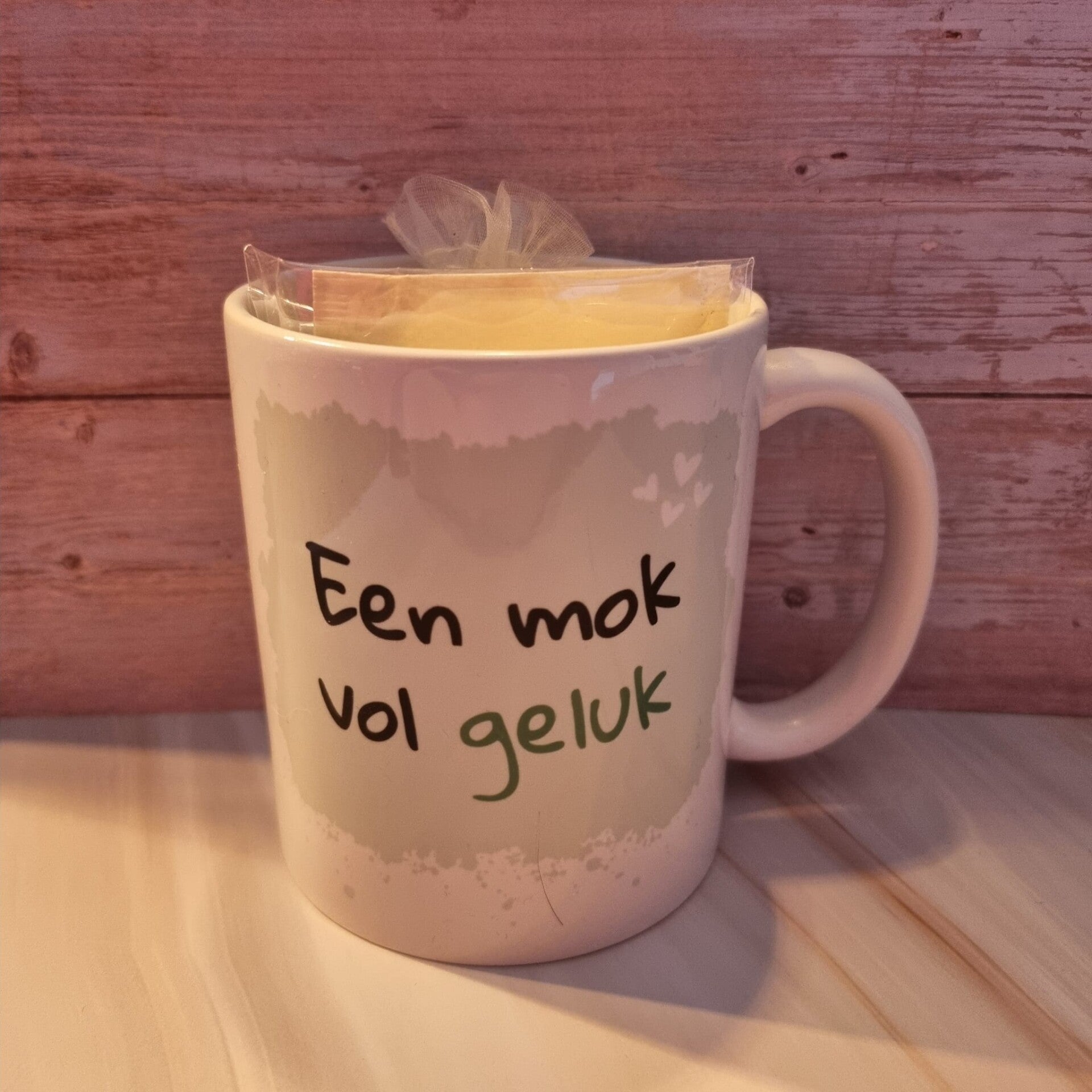 Deze mok is gevuld met 3 zakjes geluksthee, de thee is een groene/zwarte thee met rozenblaadjes, korenbloem en suikervlinders. Daarnaast zit er in de mok een leuke sleutelhanger met een groot hart eraan die voorzien is van glitters.