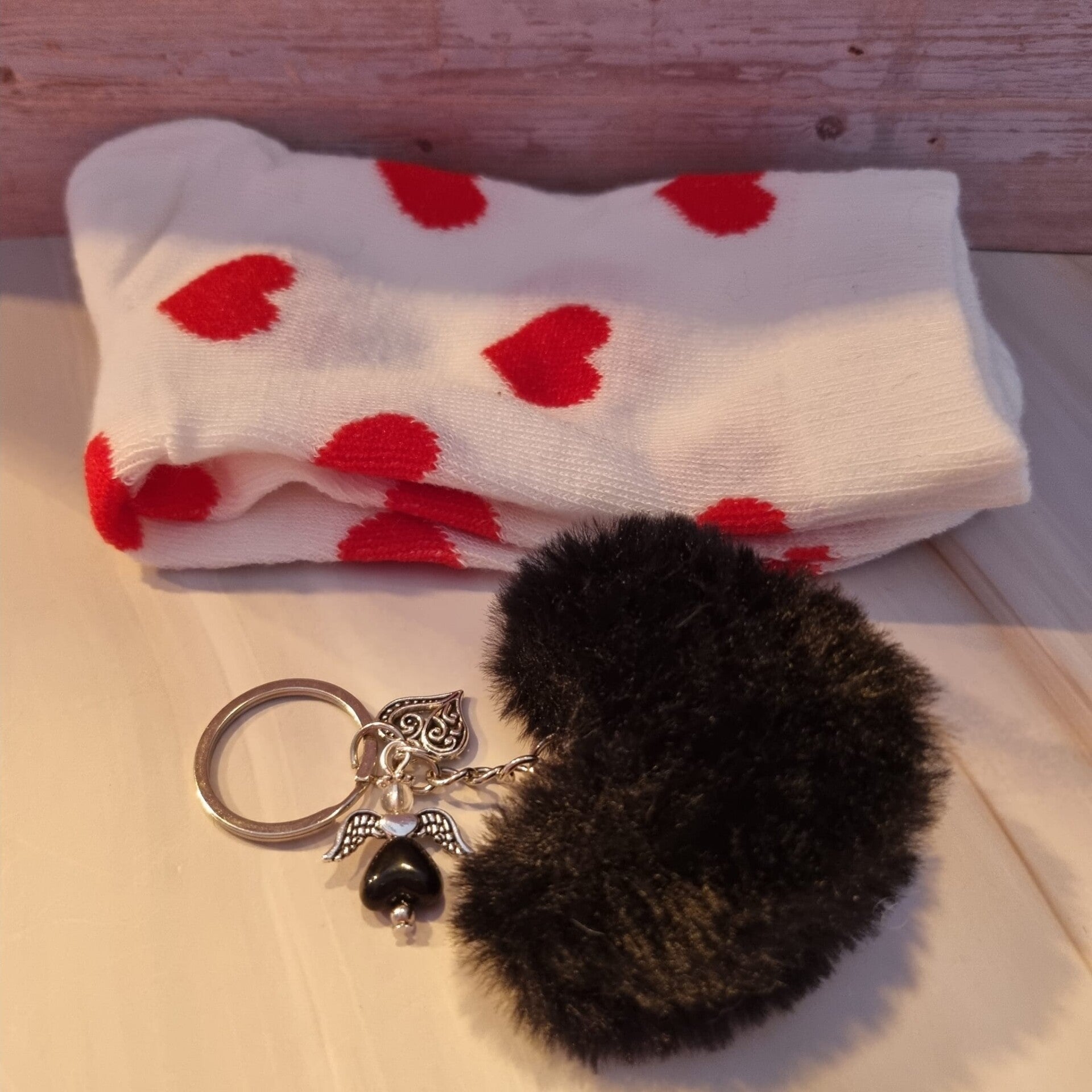 Aan de sleutelhanger hangt een groot zwart fluffy hart, met een bedeltje van een hartje en een bijpassend geluksengeltje.