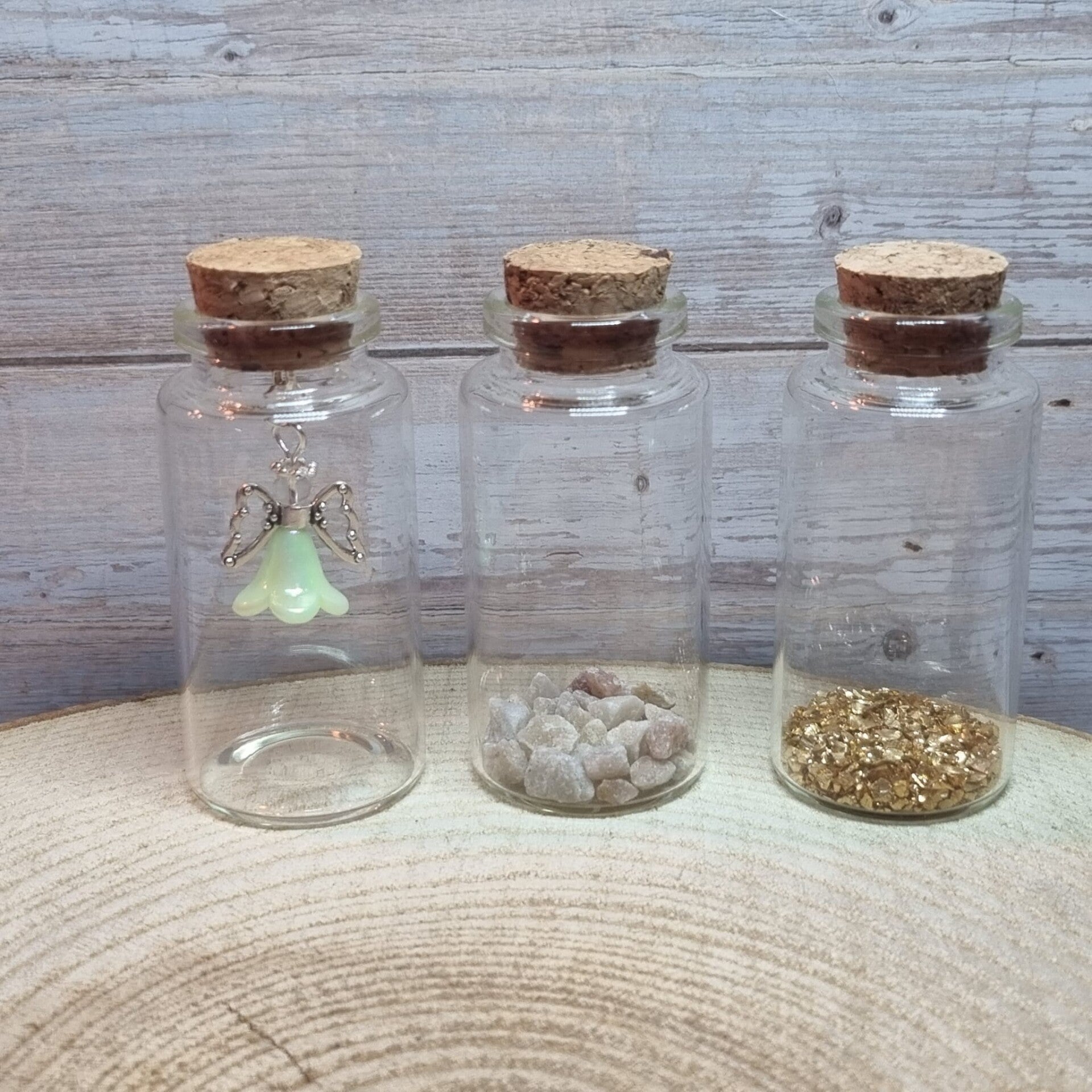 Je kunt kiezen voor een leeg flesje, kleine kiezelsteentjes of gouden steentjes.