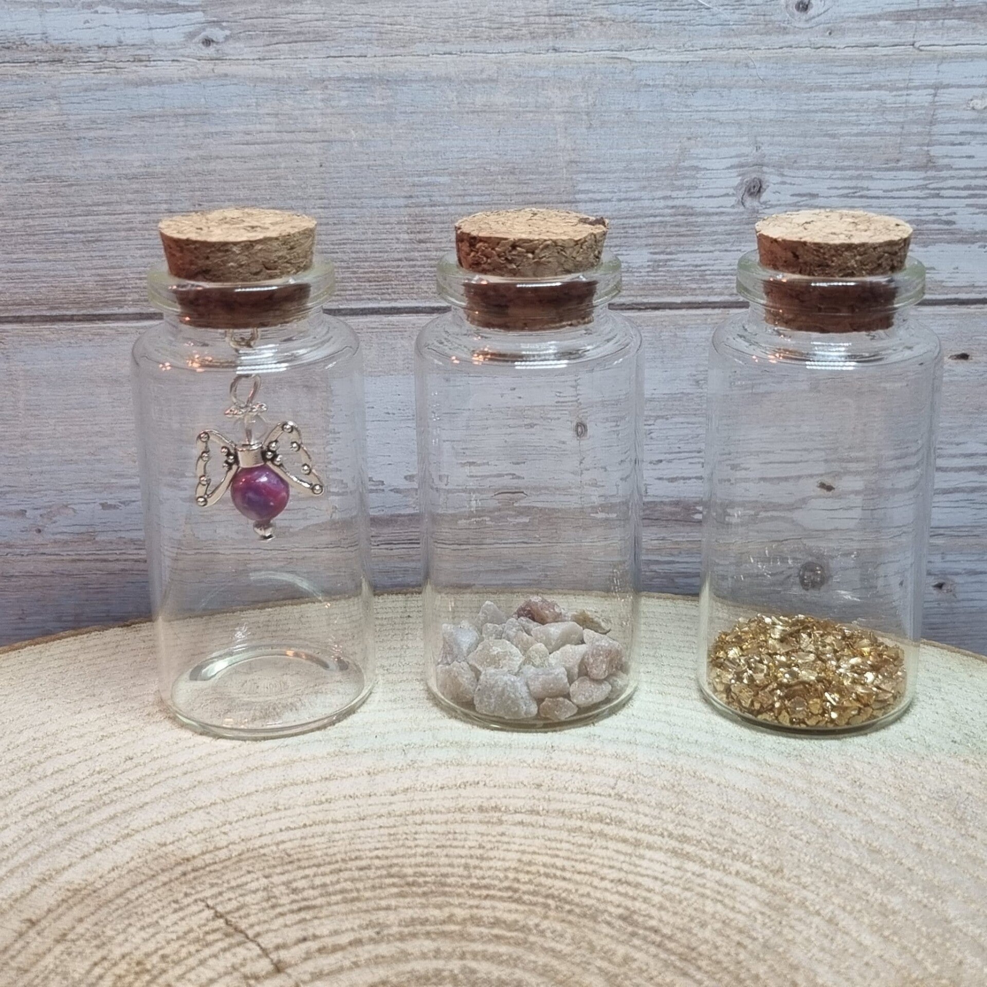 Je kunt kiezen voor een leeg flesje, kleine kiezelsteentjes of gouden steentjes.