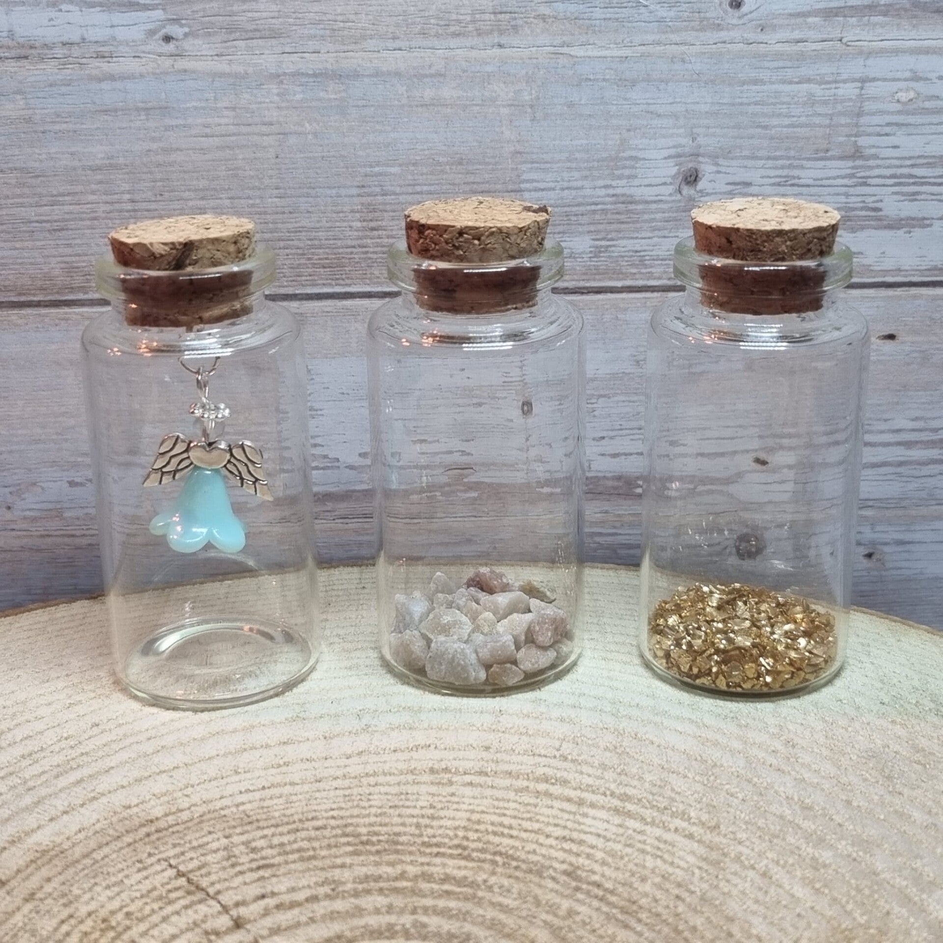 Je kunt kiezen voor een leeg flesje, kleine kiezelsteentjes of gouden steentjes.