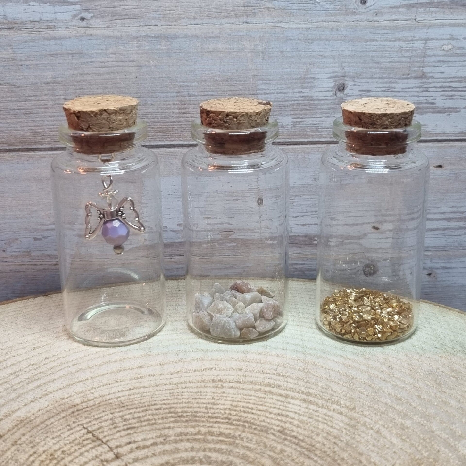 Je kunt kiezen voor een leeg flesje, kleine kiezelsteentjes of gouden steentjes.