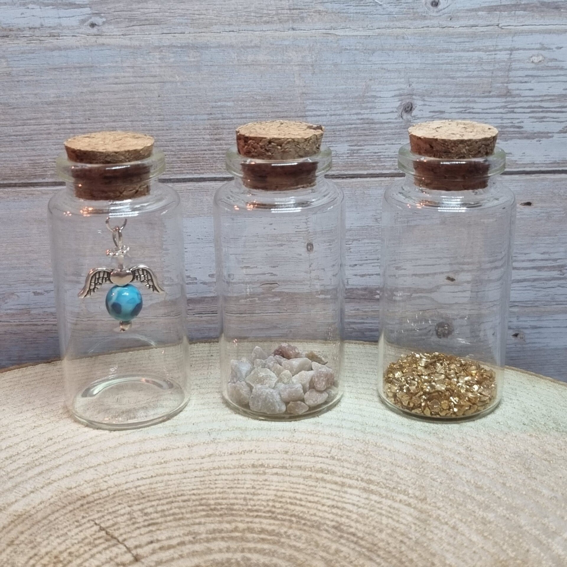 Je kunt kiezen voor een leeg flesje, kleine kiezelsteentjes of gouden steentjes.