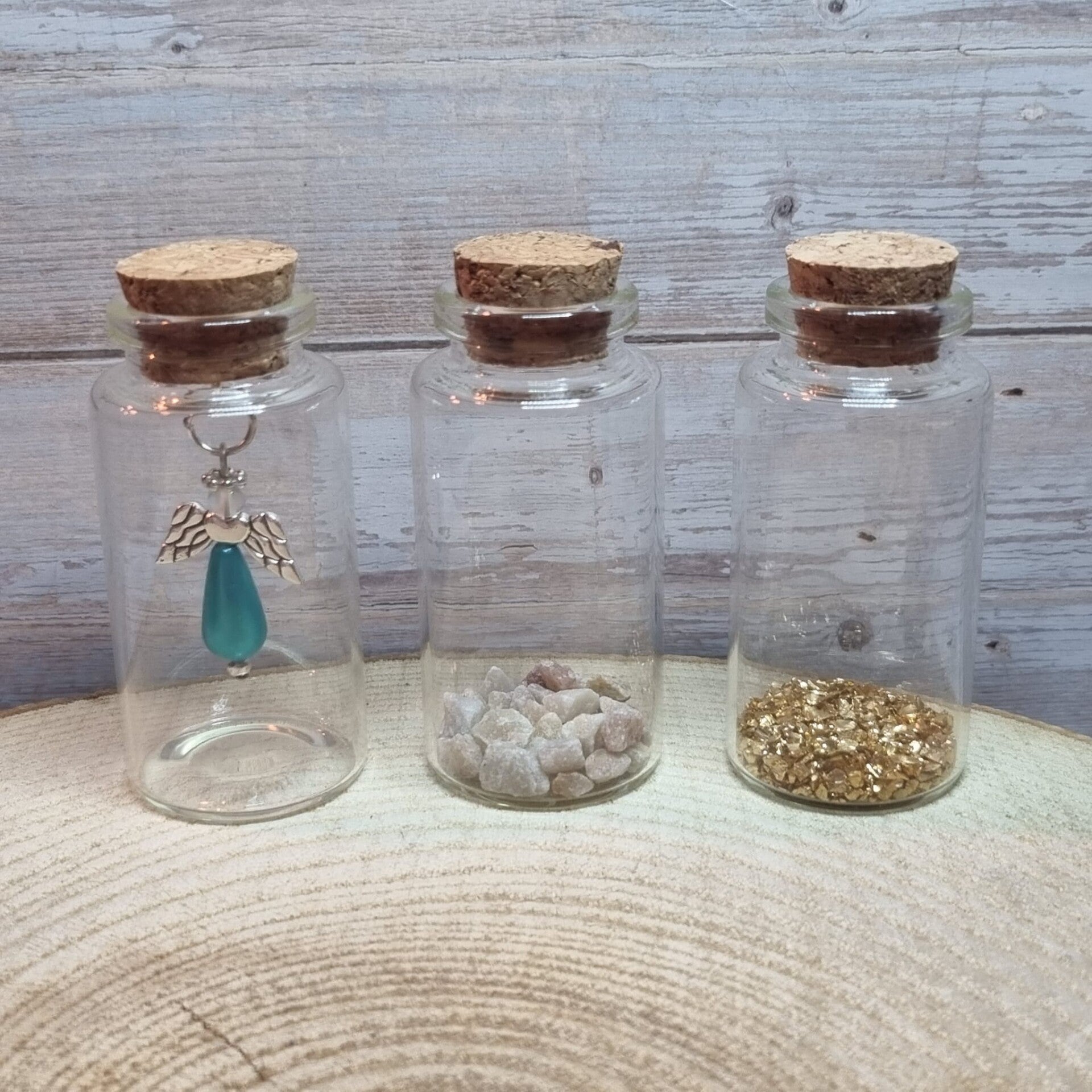 Je kunt kiezen voor een leeg flesje, kleine kiezelsteentjes of gouden steentjes.