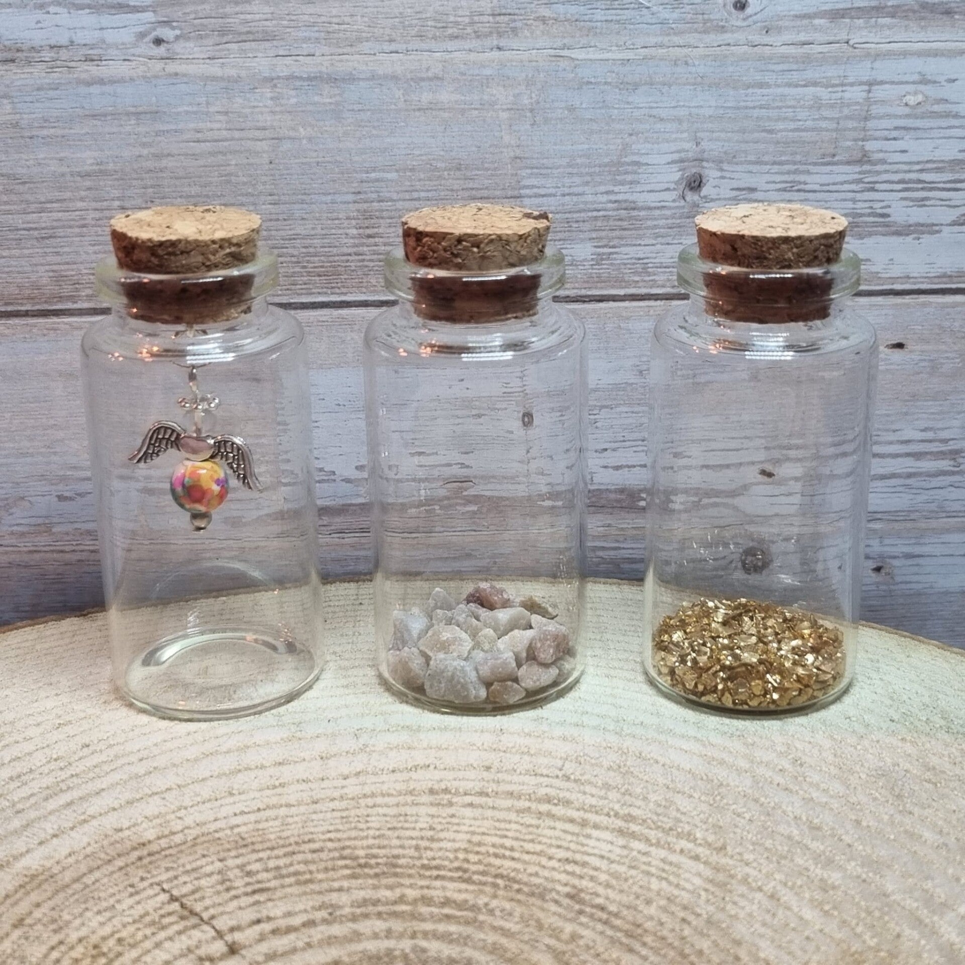 Je kunt kiezen voor een leeg flesje, kleine kiezelsteentjes of gouden steentjes.