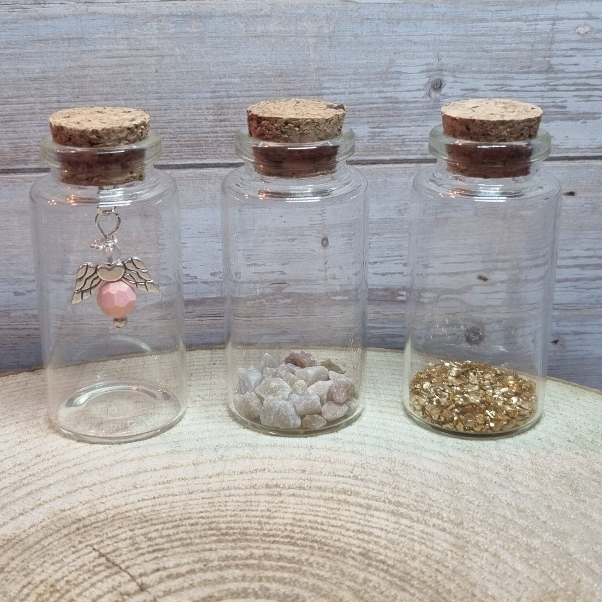 Je kunt kiezen voor een leeg flesje, kleine kiezelsteentjes of gouden steentjes.