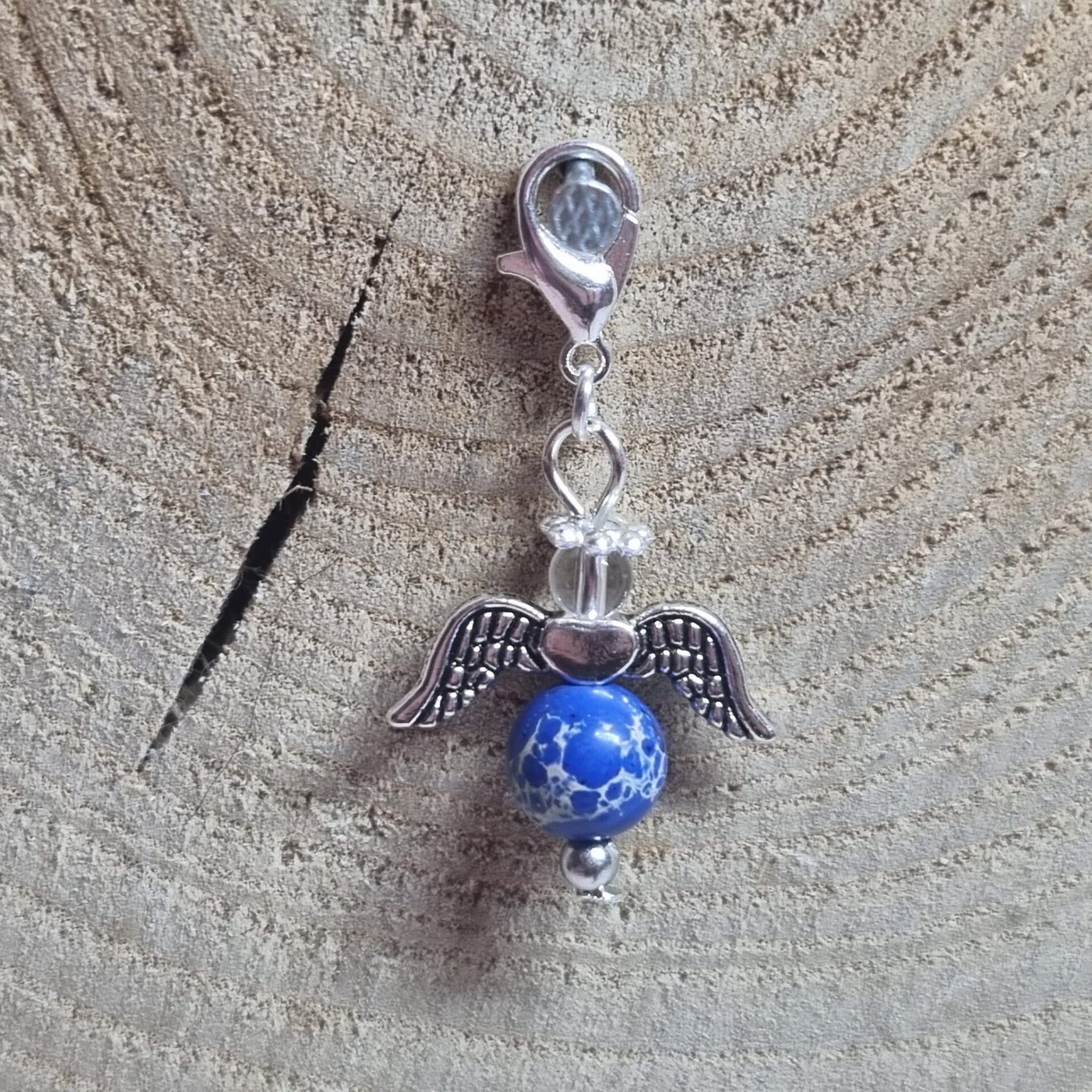 Dit geluksengeltje heeft een ronde blauwe 8 mm kraal met beige accenten als buik en transparante 4 mm kraal als hoofdje. Het geluksengeltje is verder in zilverkleurig metaal afgewerkt.